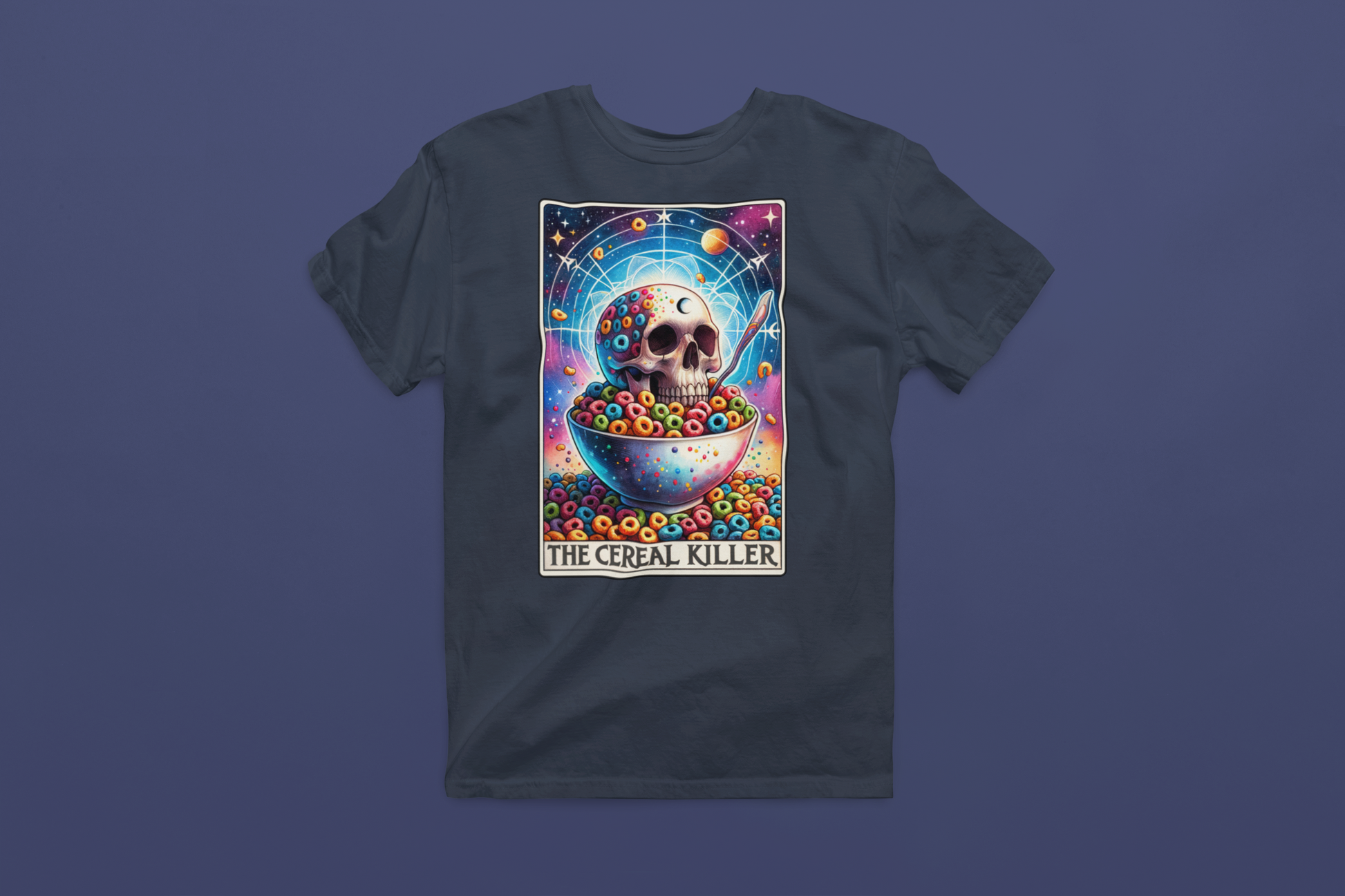 Gear up with our 'Cereal Killer' tee - a bold statement piece that's not for the faint of heart. Featuring a tarot card motif with a skull rising from a bowl of vibrant cereal, it's a gritty reminder that breakfast is not for the weak. Embrace your appetite for destruction and start your day with a bang. This tee is for those who take their breakfast and attitude seriously.