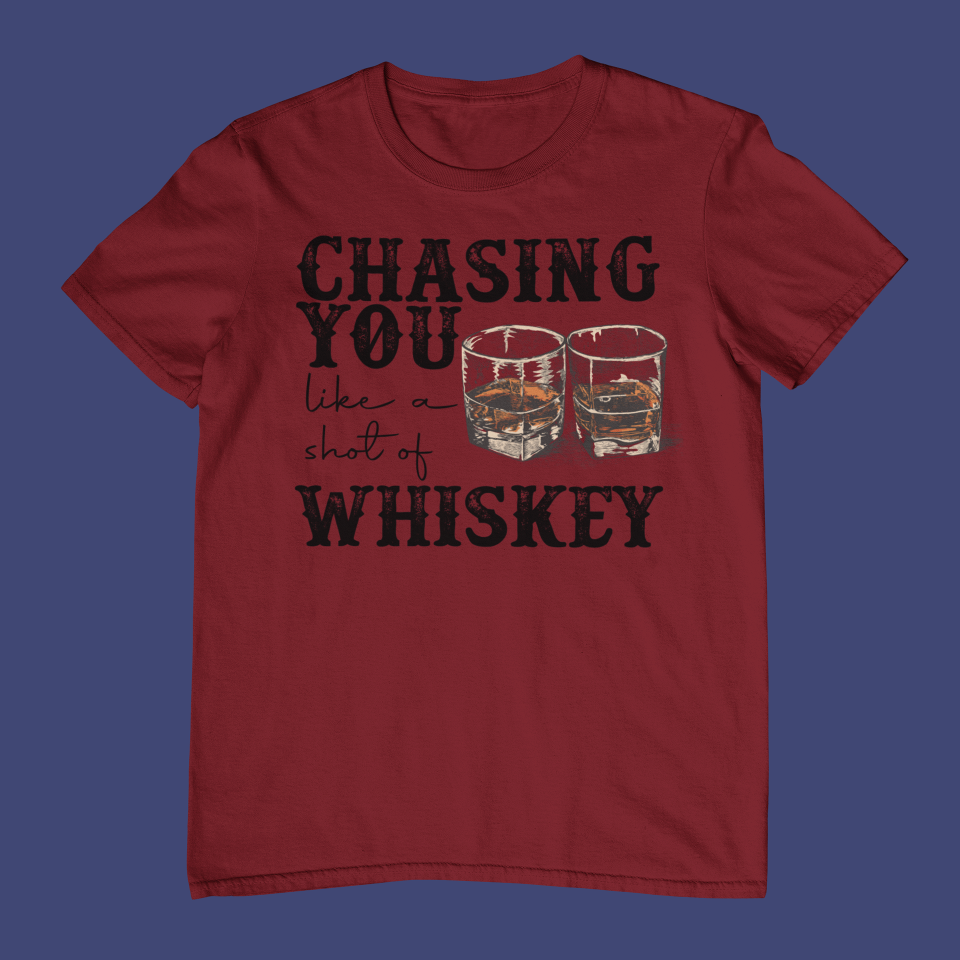 Embrace the thrill of the chase with our Chasing You Like a Shot of Whiskey t-shirt. Crafted for those who pursue adventure with the same intensity they savor in a fine drink, or for those who love a good country song. This tee is the perfect blend of style and spontaneity, capturing the essence of pursuing what sets your soul on fire. Wear it proudly and let the world know that life is an intoxicating journey worth sipping slowly.