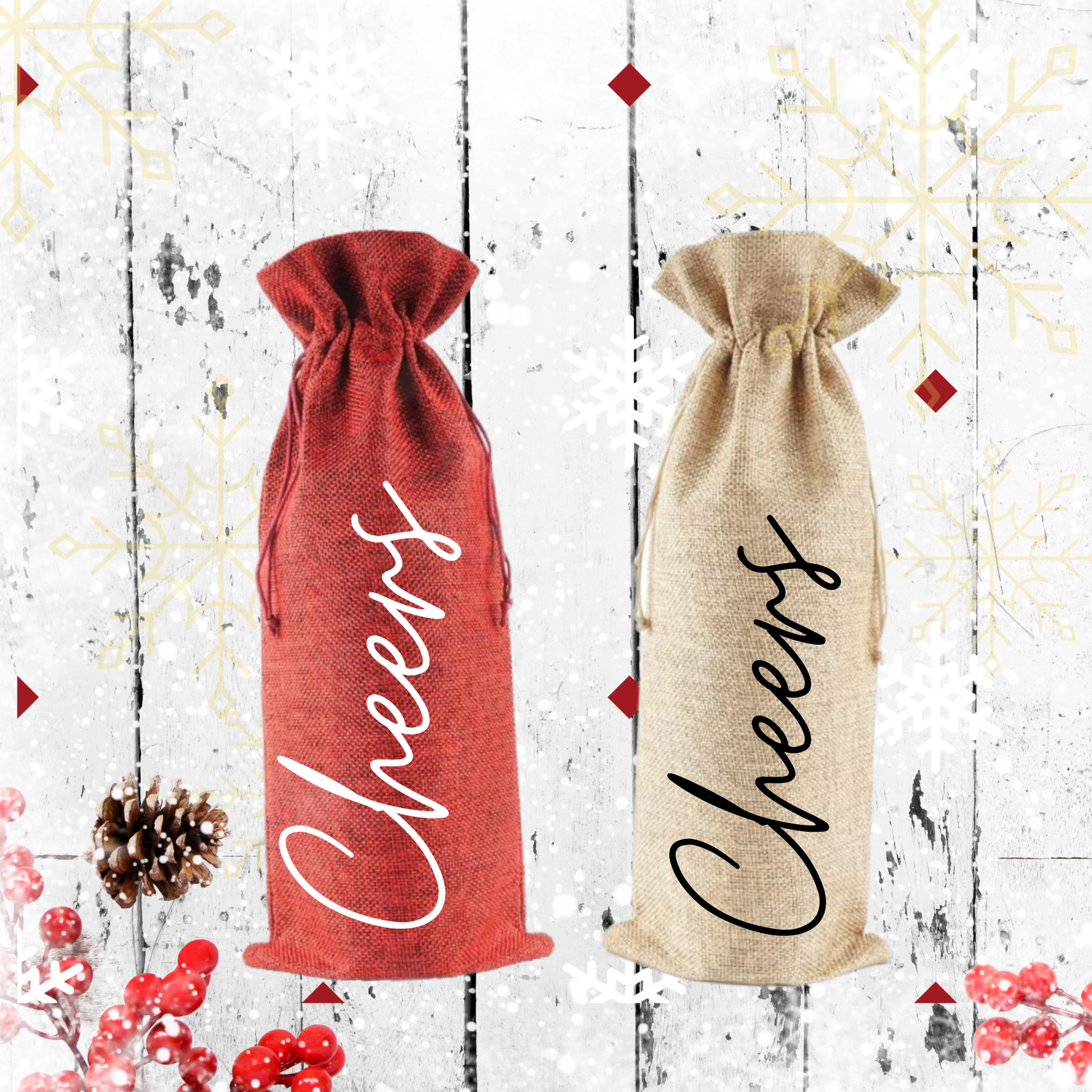 Get ready to raise a glass with the Cheers burlap wine bottle bag. Whether you're gifting a bottle of red, white, or something stronger, this bag adds a rustic touch to your holiday celebrations. Available in classic Holiday Red and Natural. The simple "Cheers" print is the perfect nod to the season of toasts, making this bag a must-have for any holiday gathering or celebration. Give the gift of good wine and good vibes.