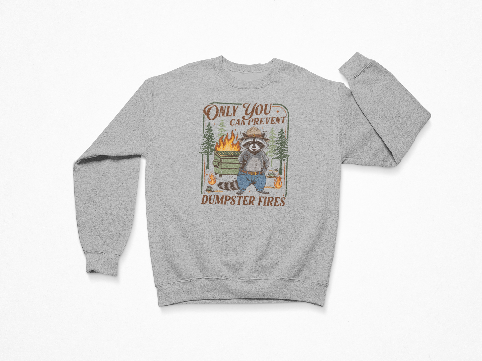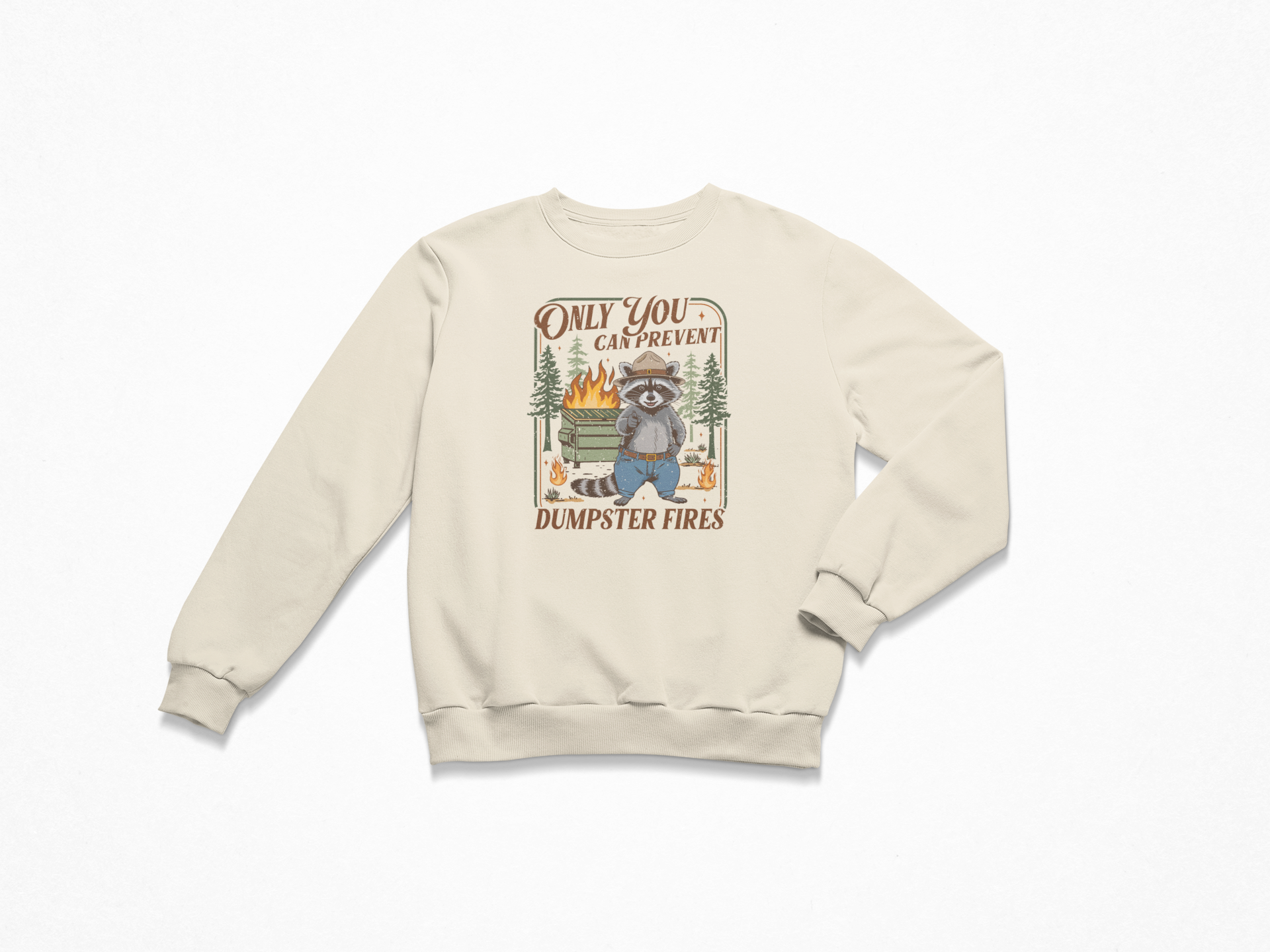 Our Dumpster Fire Ranger crewneck features one slightly unhinged raccoon ranger standing in front of the chaos like, "I warned you." Vintage grit. Smokey-inspired sass. Zero patience for nonsense.