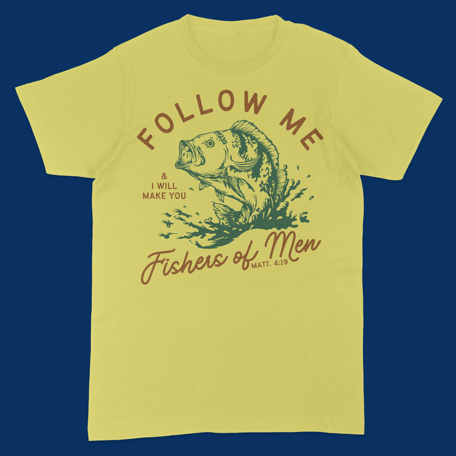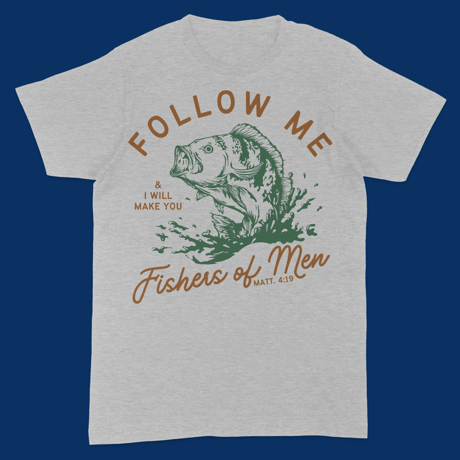 Step into the journey of faith with our 'Fishers of Men' tee, inspired by the timeless words of Matthew 4:19. This shirt is more than apparel; it's a declaration of commitment to following the path laid out by Christ. Wear it as a reminder of the call to discipleship and the promise of transformation. Let your shirt speak volumes as you walk the path of faith.