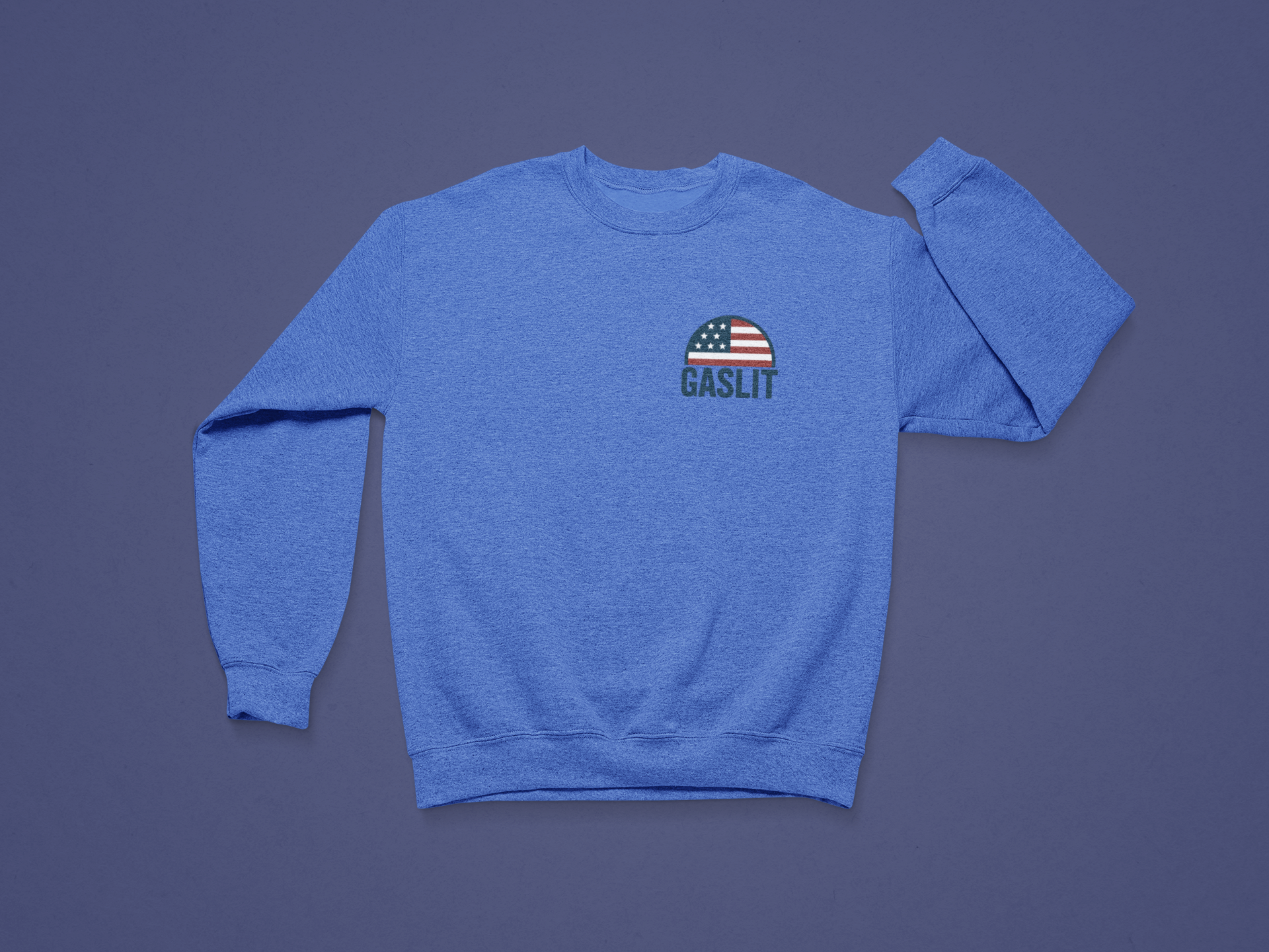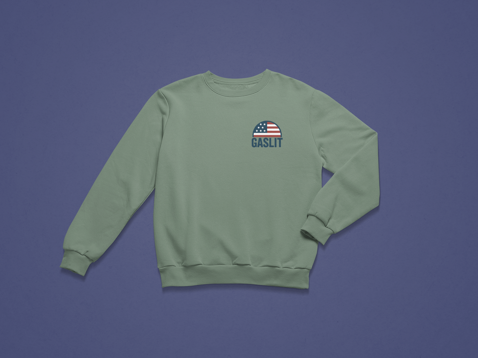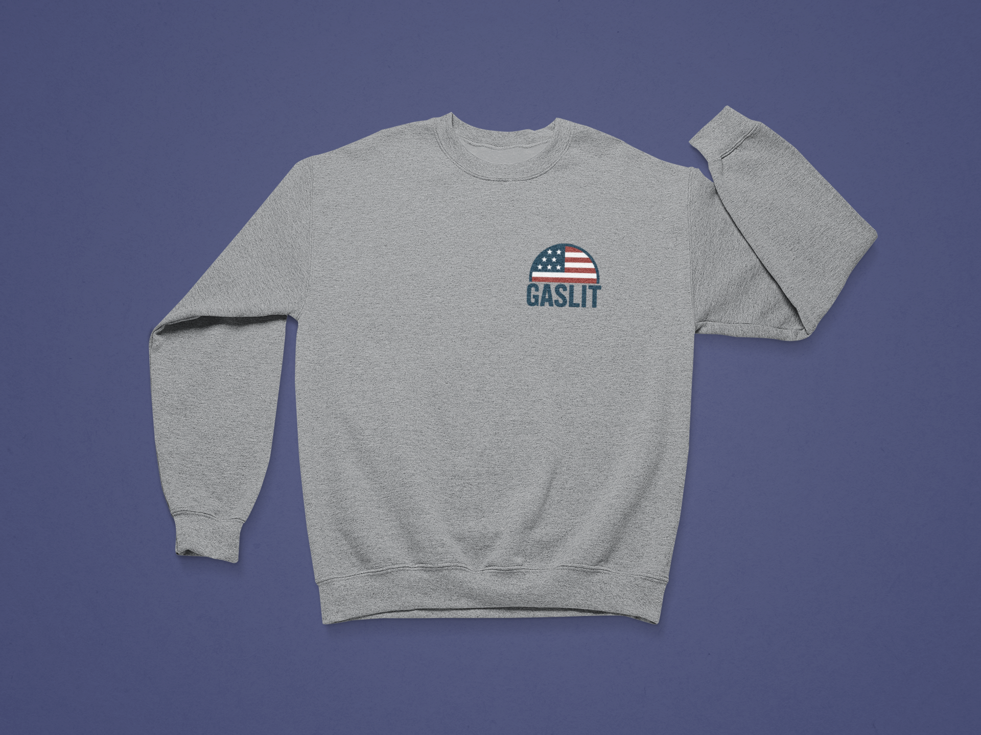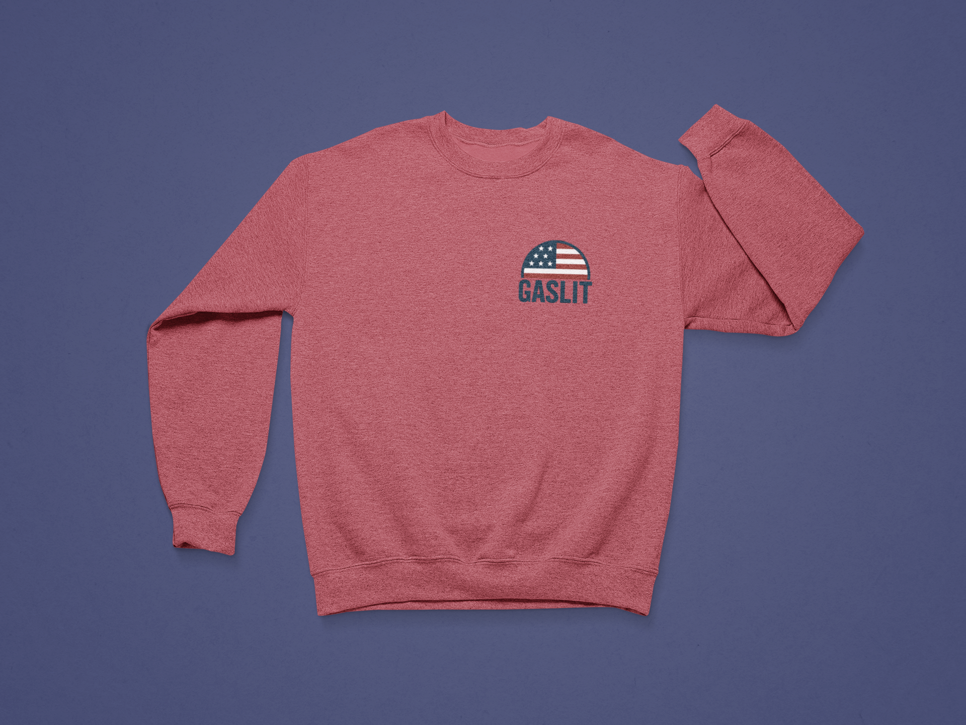 Truth hurts. This crewneck sweatshirt does too. Loud, proud, and draped in red, white, and pissed-off, Gaslit is for the ones who've had enough of the lies but still show up, speak out, and stand firm. Vintage flag design, distressed attitude, and a name that hits like a truth bomb. Patriotism never looked so good.