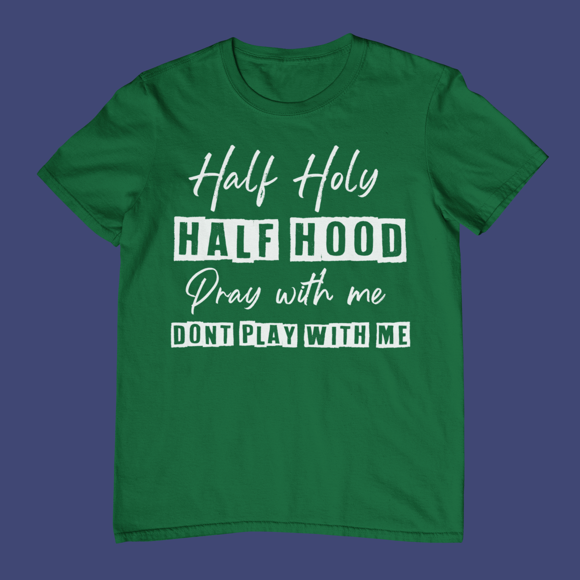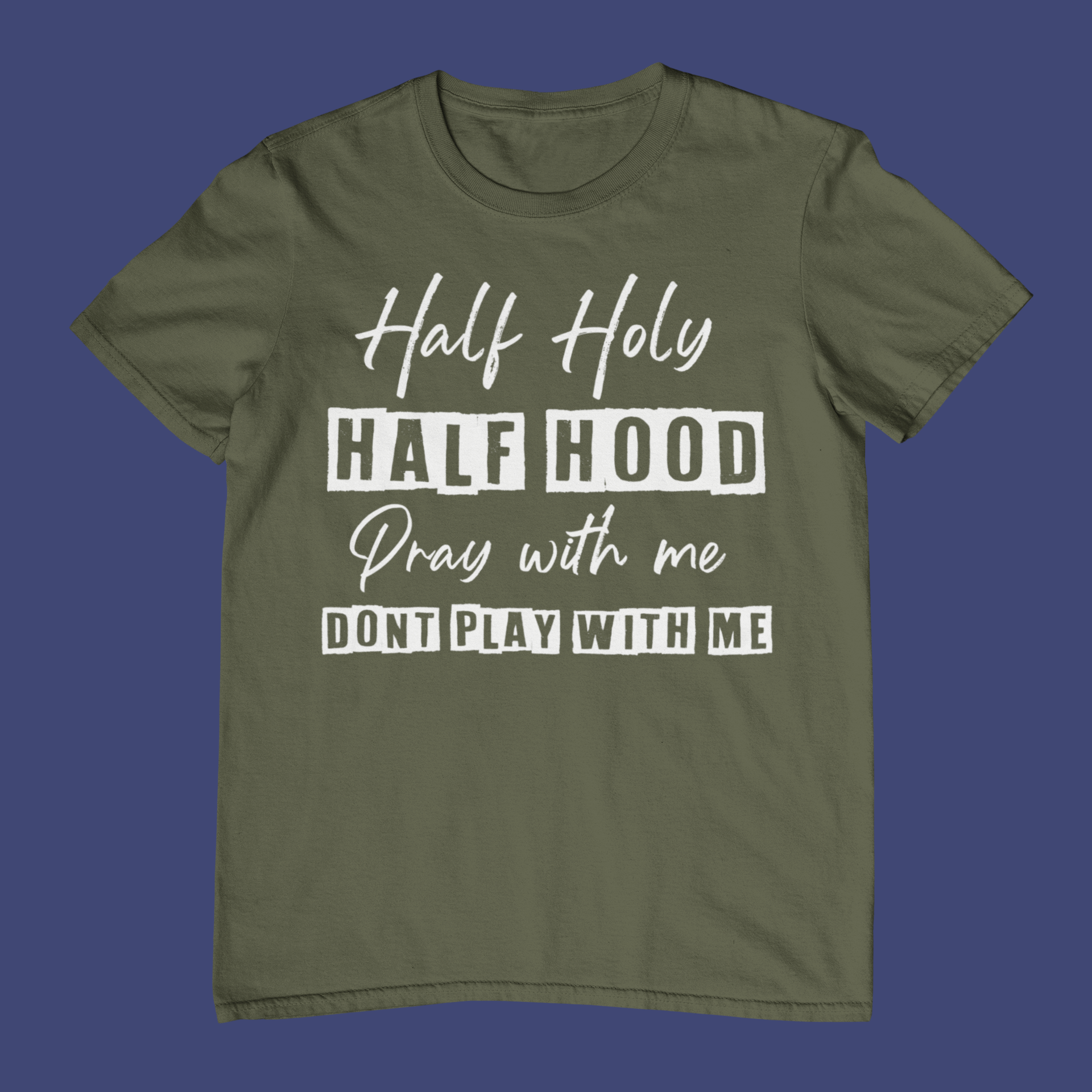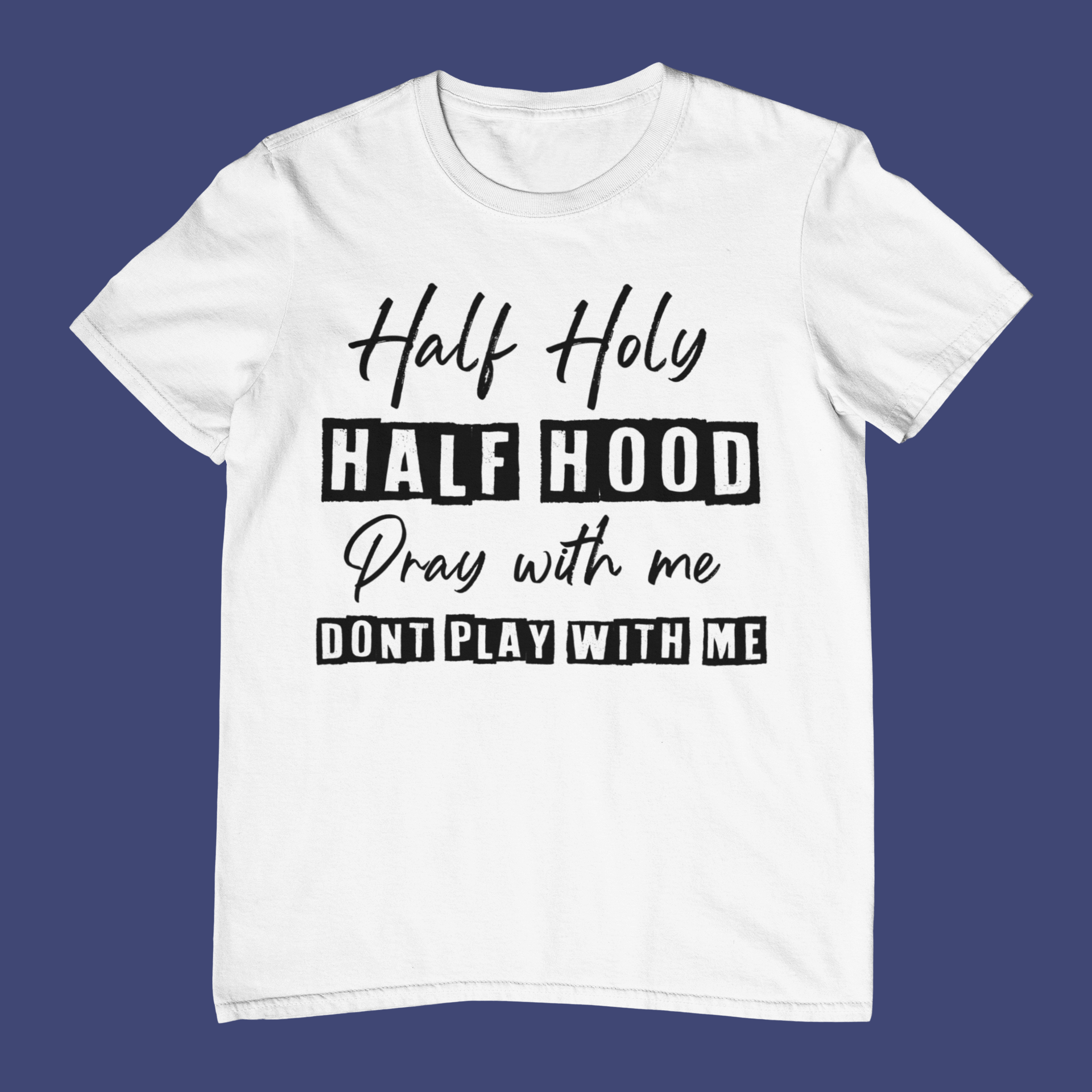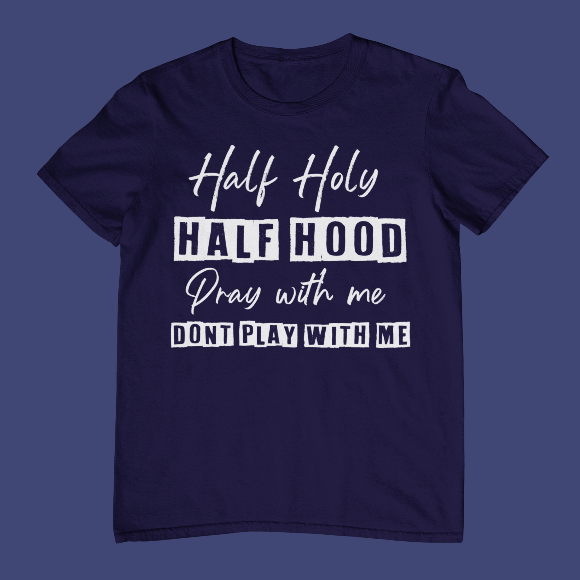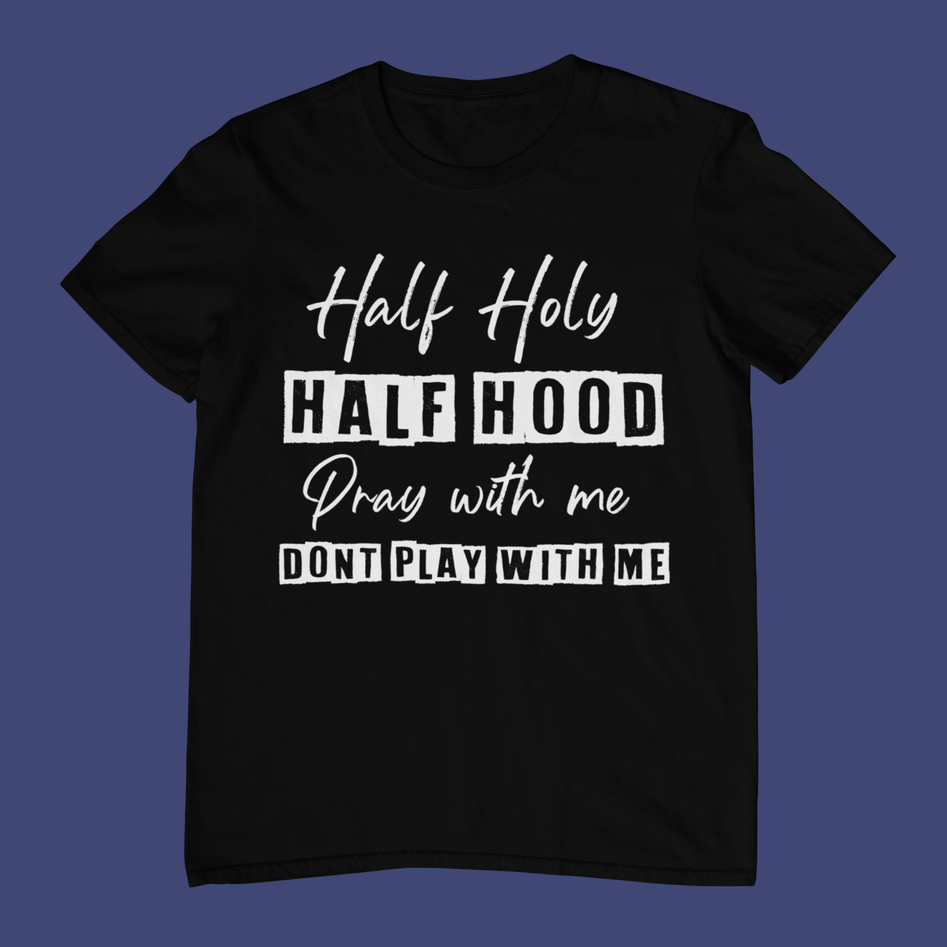 Embrace your unique blend of sacred and street with this women's t-shirt. Featuring the bold statement "Half Holy, Half Hood. Pray with Me, Don't Play with Me," this shirt is a powerful expression of individuality, seamlessly fusing spirituality with streetwise attitude. Crafted for those who walk the line between grace and grit, it's a reminder to be approached with reverence, not recklessness.