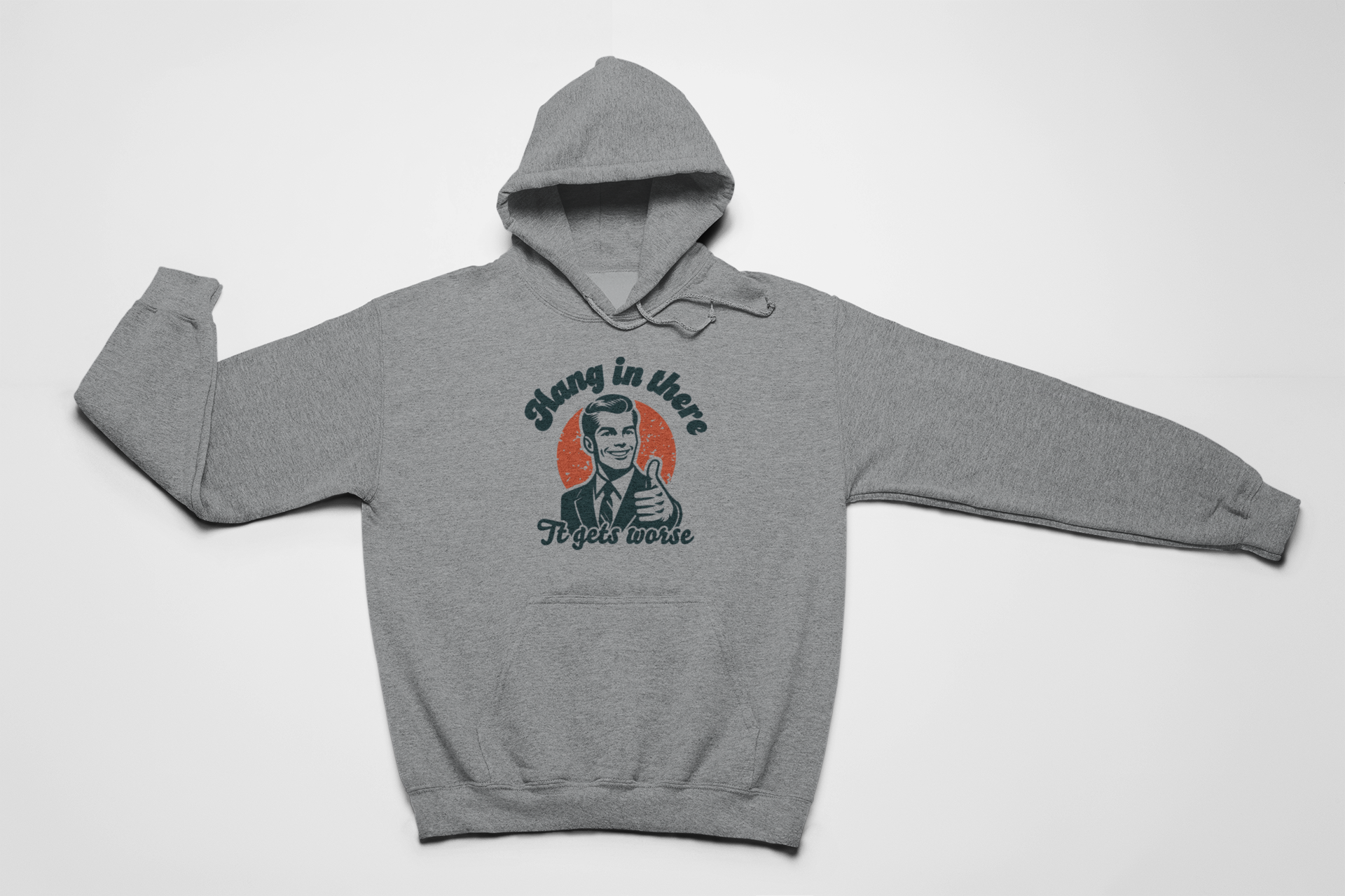 Meet the Hang in There hoodie- your dose of brutal honesty, served with a smile. Featuring a vintage guy in a suit, thumbs up and all, this design is for those who laugh in the face of chaos. Perfect for anyone who knows that sometimes the best way to get through the day is with a little sarcasm and a lot of grit. Throw it one, embrace the struggle, and keep going... because if it's gonna get worse, you might as well look good doing it.