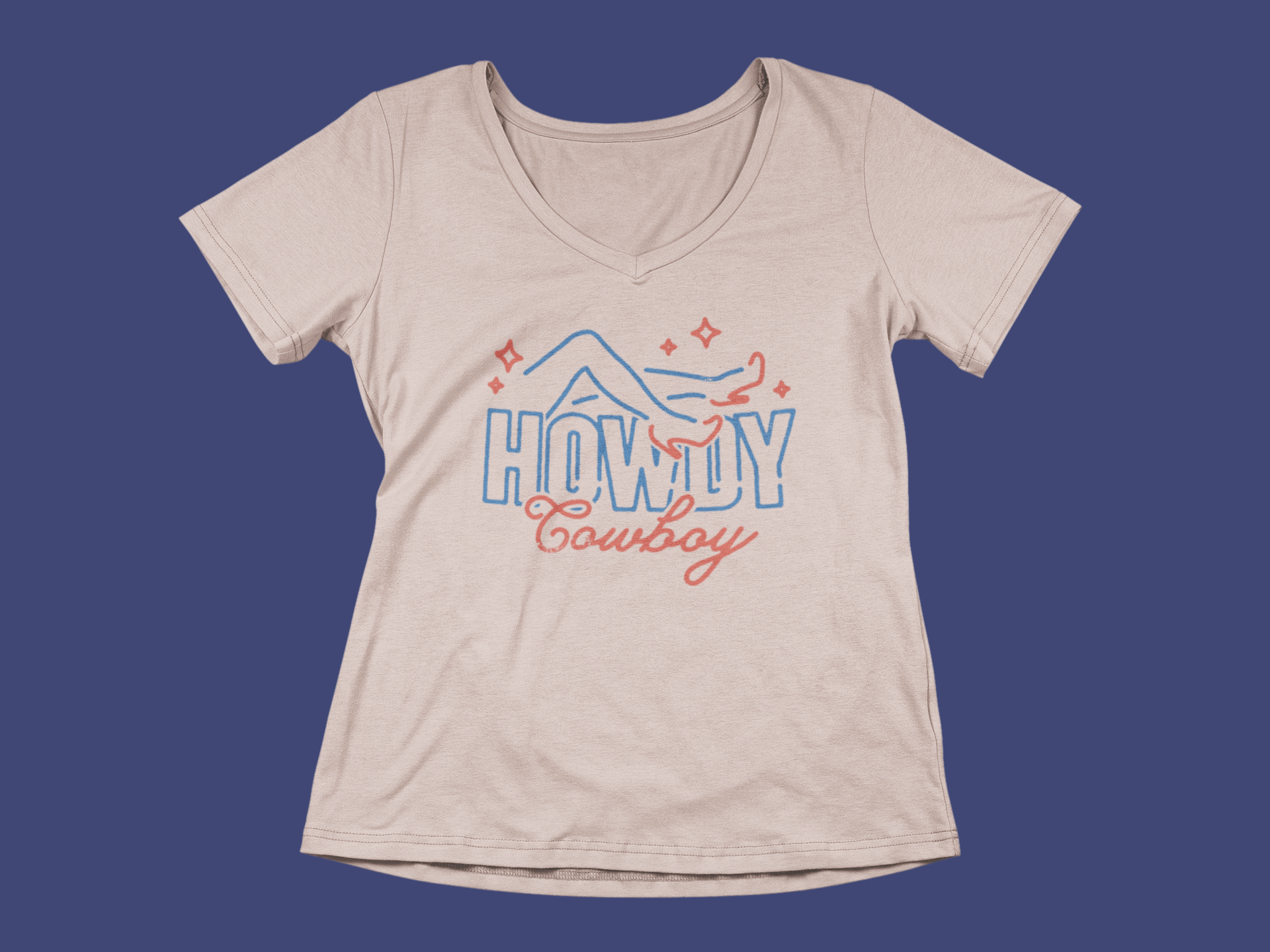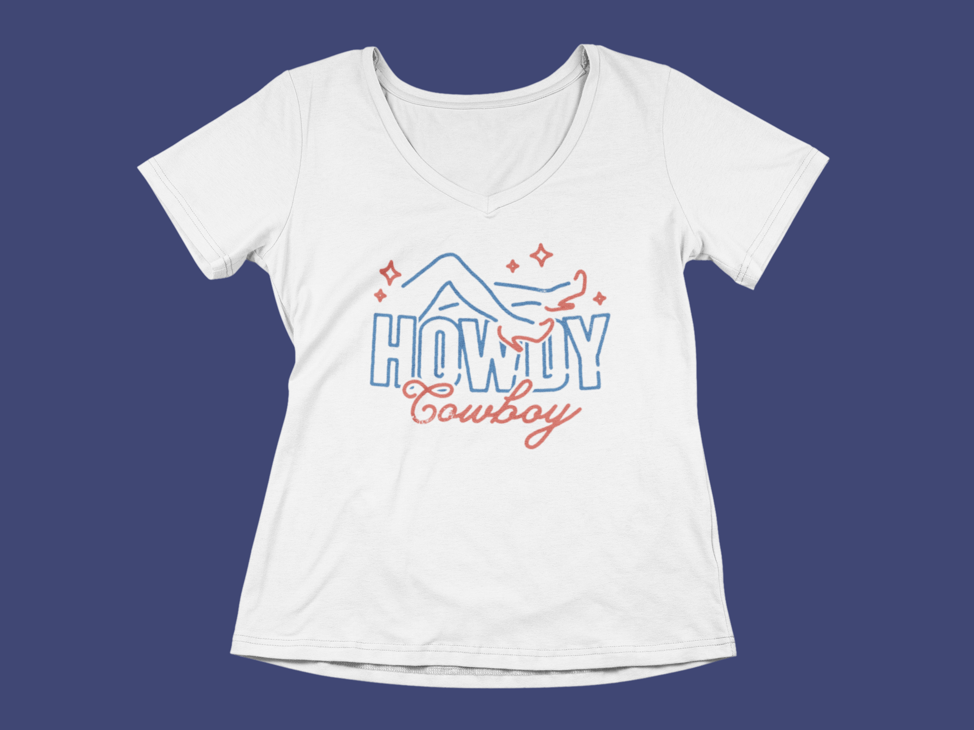 Transport yourself to the golden age of Western glam with our vintage-style Howdy Cowboy v-neck t-shirt. This timeless piece combines the charm of yesteryear with a modern twist. The slightly distressed design adds a touch of nostalgia, making it the perfect wardrobe staple for those who appreciate a blend of retro aesthetic and playful fashion. Step into a world of vintage allure and say Howdy in style with this cozy crewneck sweatshirt.