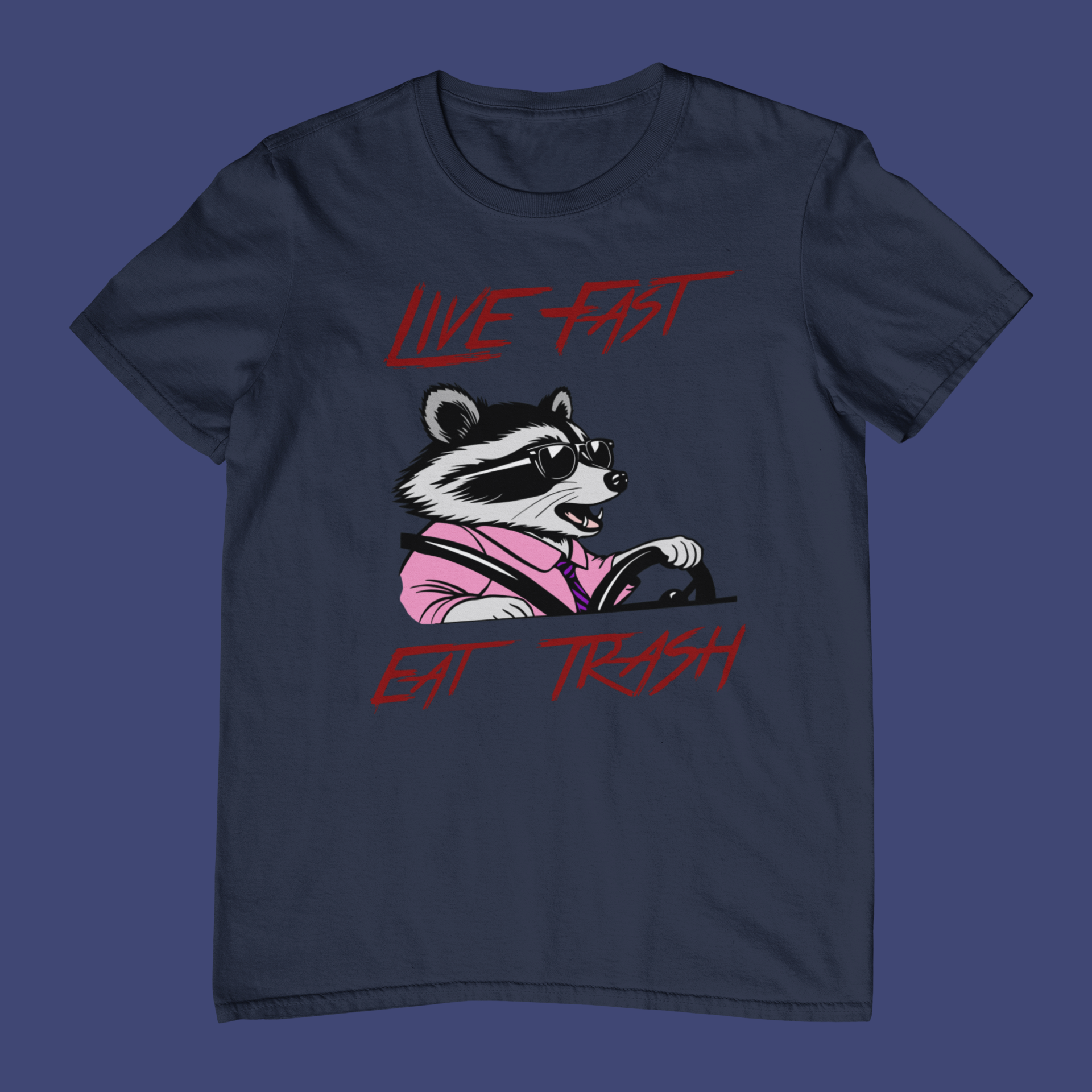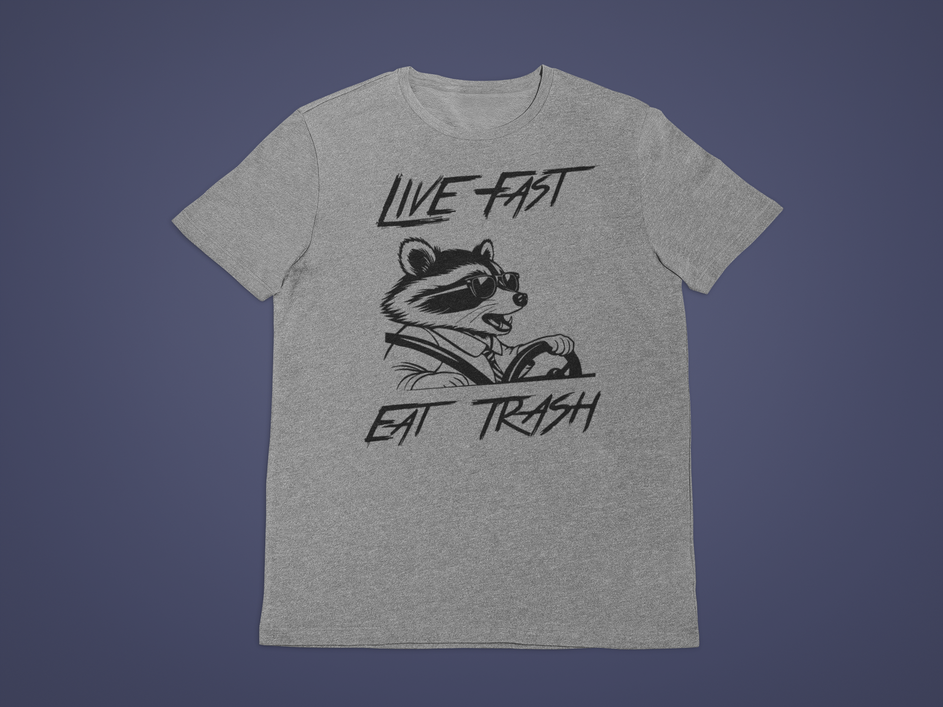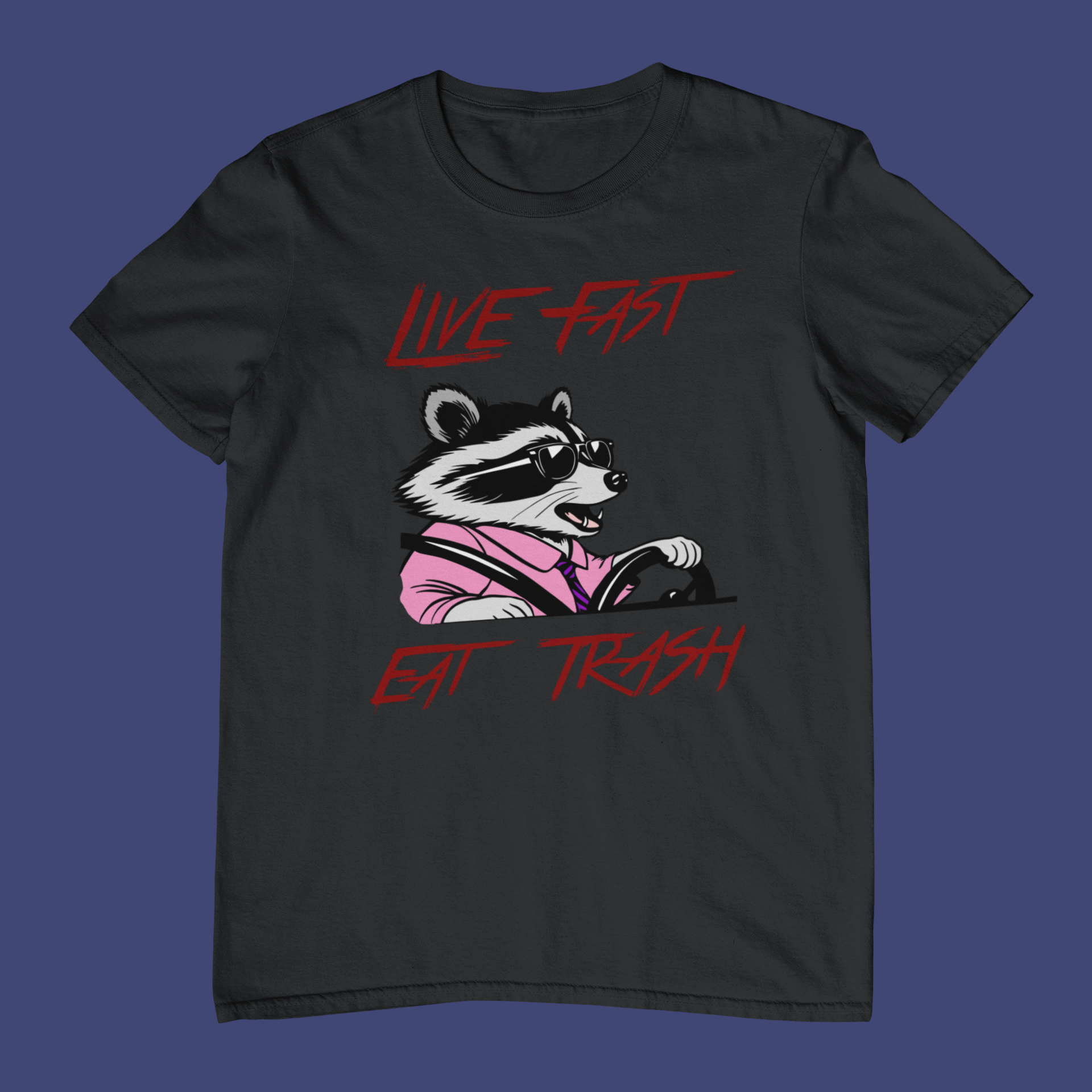 Listen up, rebels with a taste for the unconventional! Rev up your attitude with our "Live Fast. Eat Trash" t-shirt. It's not just a shirt; it's a statement - live life on the wild side, snack on chaos, and let this raccoon be your unapologetic guide to tearing up the asphalt of existence. Buckle up, embrace the chaos, live on the edge, and let this snazzy trash panda be your spirit animal.