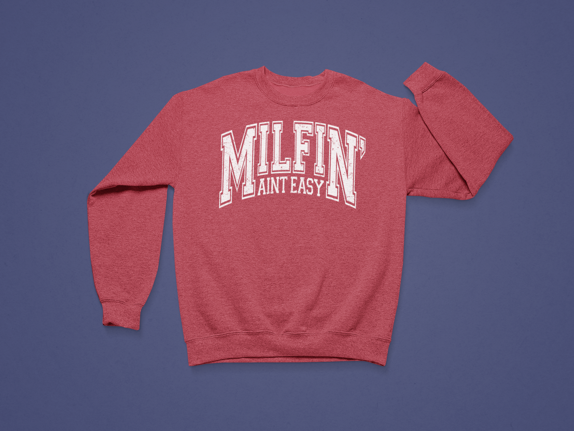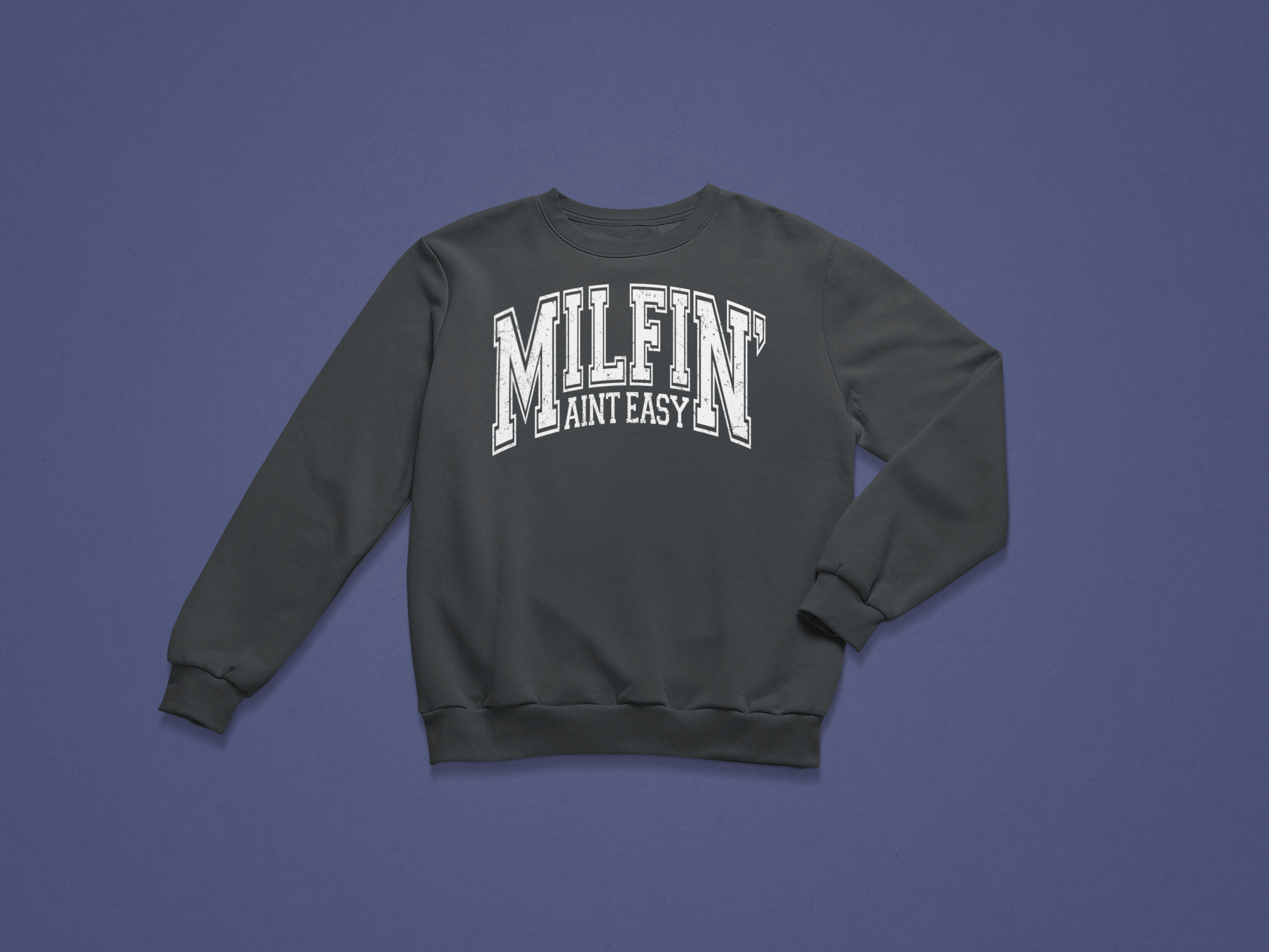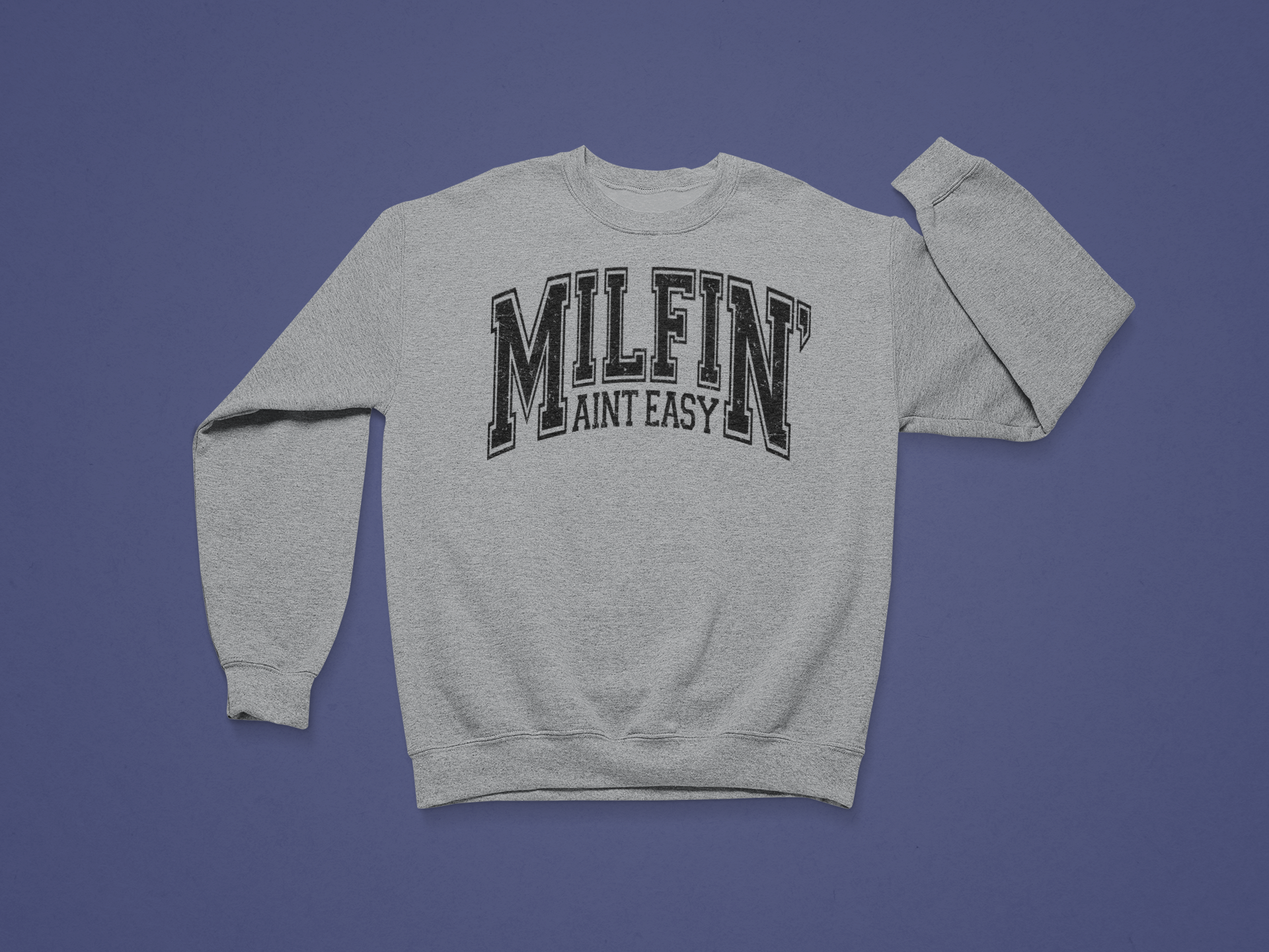 Brace yourself for the truth bomb with our "MILFin' Ain't Easy" crewneck sweatshirt. This shirt is for all the badass moms who juggle life like a pro and still manage to look damn good doing it. It's the perfect way to show the world that being a MILF is a full-time job - and you're nailing it.