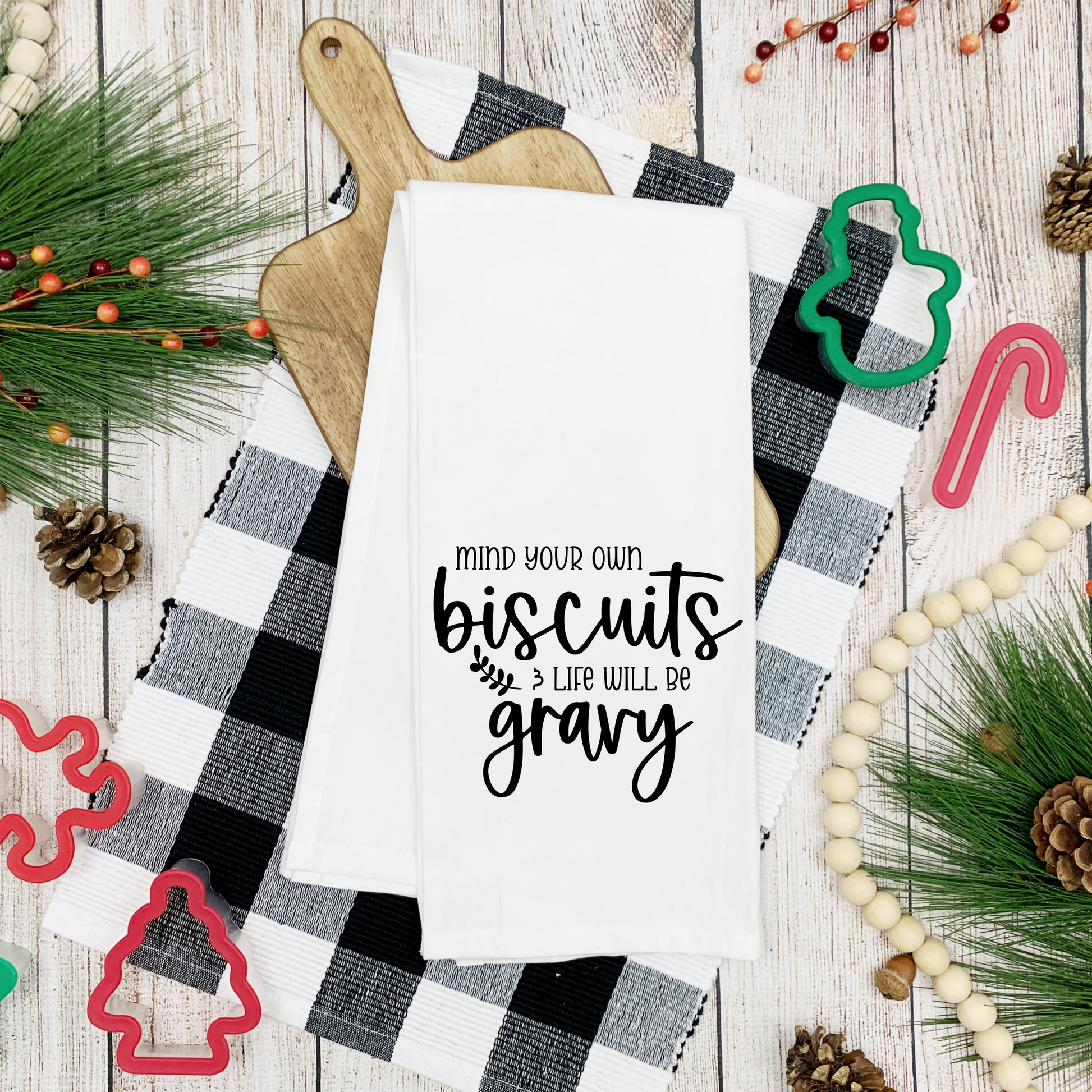 Keep your kitchen cool and your attitude even cooler with the Mind Your Biscuits flour sack towel. Printed with the down-home wisdom, "Mind Your Biscuits & Life Will Be Gravy," this towel is a nod to anyone who knows that a little care - and a lot of patience - goes a long way.