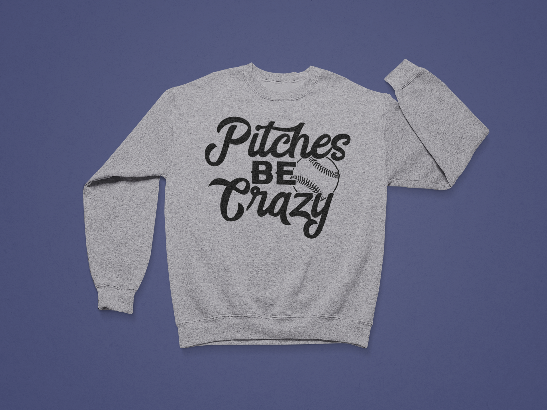 Gear up like a true champion with our 'Pitches Be Crazy' crewneck sweatshirt: a fearless tribute to the gritty allure of America's pastime. Built for the relentless fan who lives and breathes baseball, this sweatshirt is more than shirt - it's a battle standard. Whether you're cheering from the bleachers or pounding the pavement, let the world know that when it comes to your team, the pitches may be wild, but your loyalty runs deeper than the seventh-inning stretch.