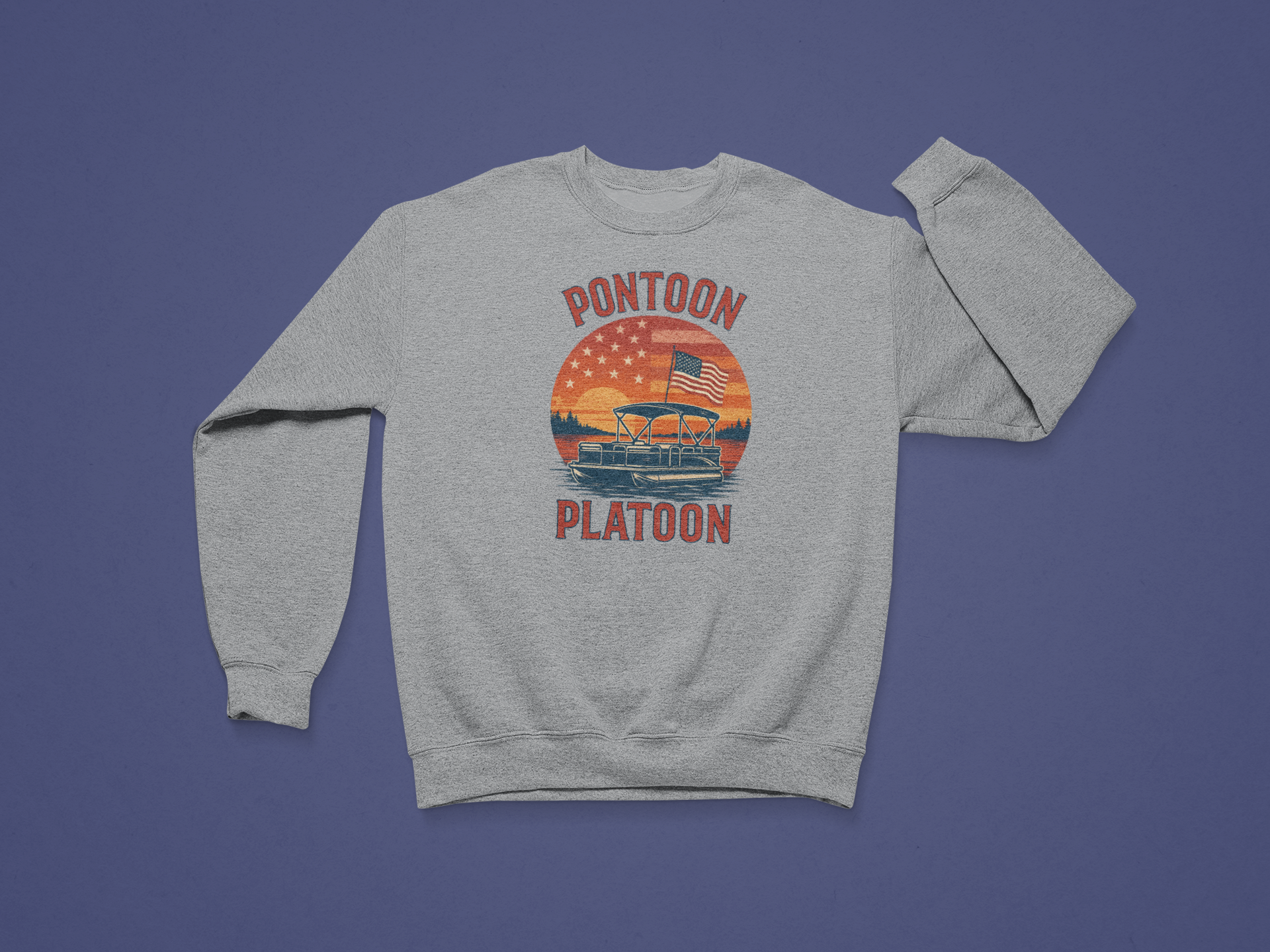 Suns out, anchors down, and the playlist is set to "float mode." The Pontoon Platoon crewneck is made for those who know the best memories come with a cold drink in hand and a lazy wake behind the boat. This laid-back design features vintage lake vibes and an easy going fit-perfect for cruising, chilling, and claiming your spot at the sandbar. Join the Pontoon Platoon - no meetings, no rules, just float.