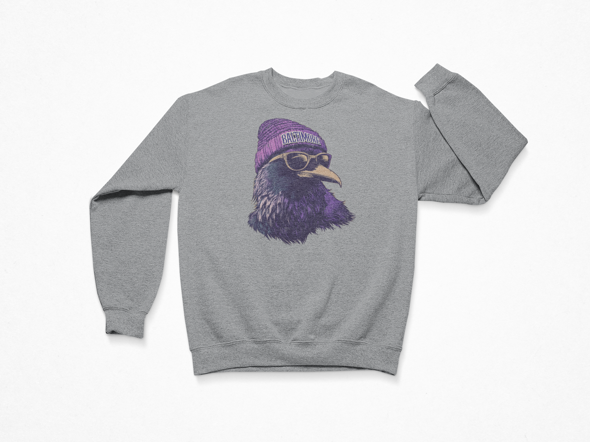 Baltimore doesn't just play football - they hunt. The Raven Savage crewneck captures that predator mentality, with a hard-eyed raven rocking shades and a beanie, ready to swoop in and own game day.