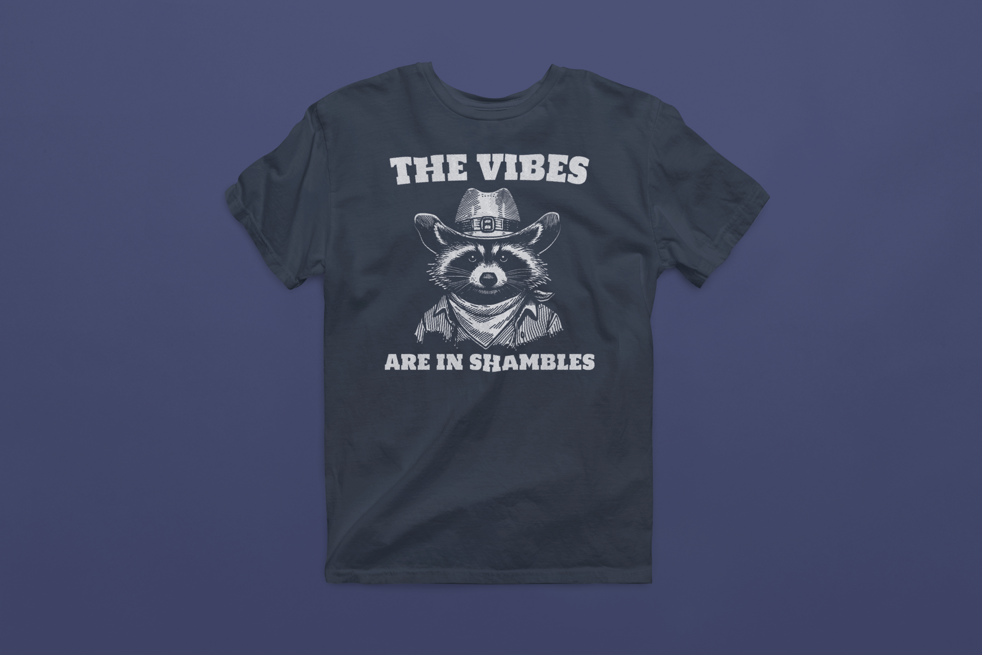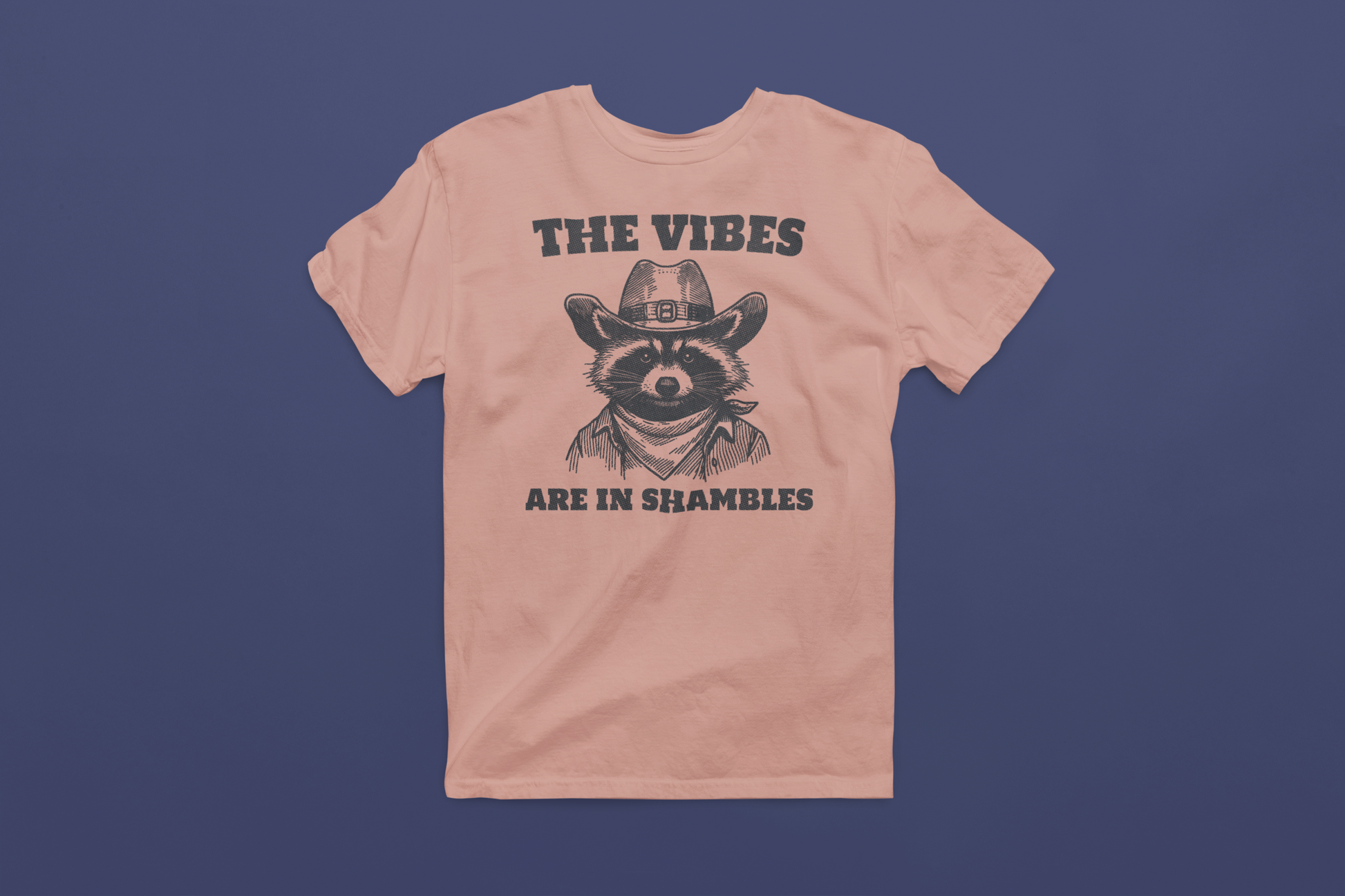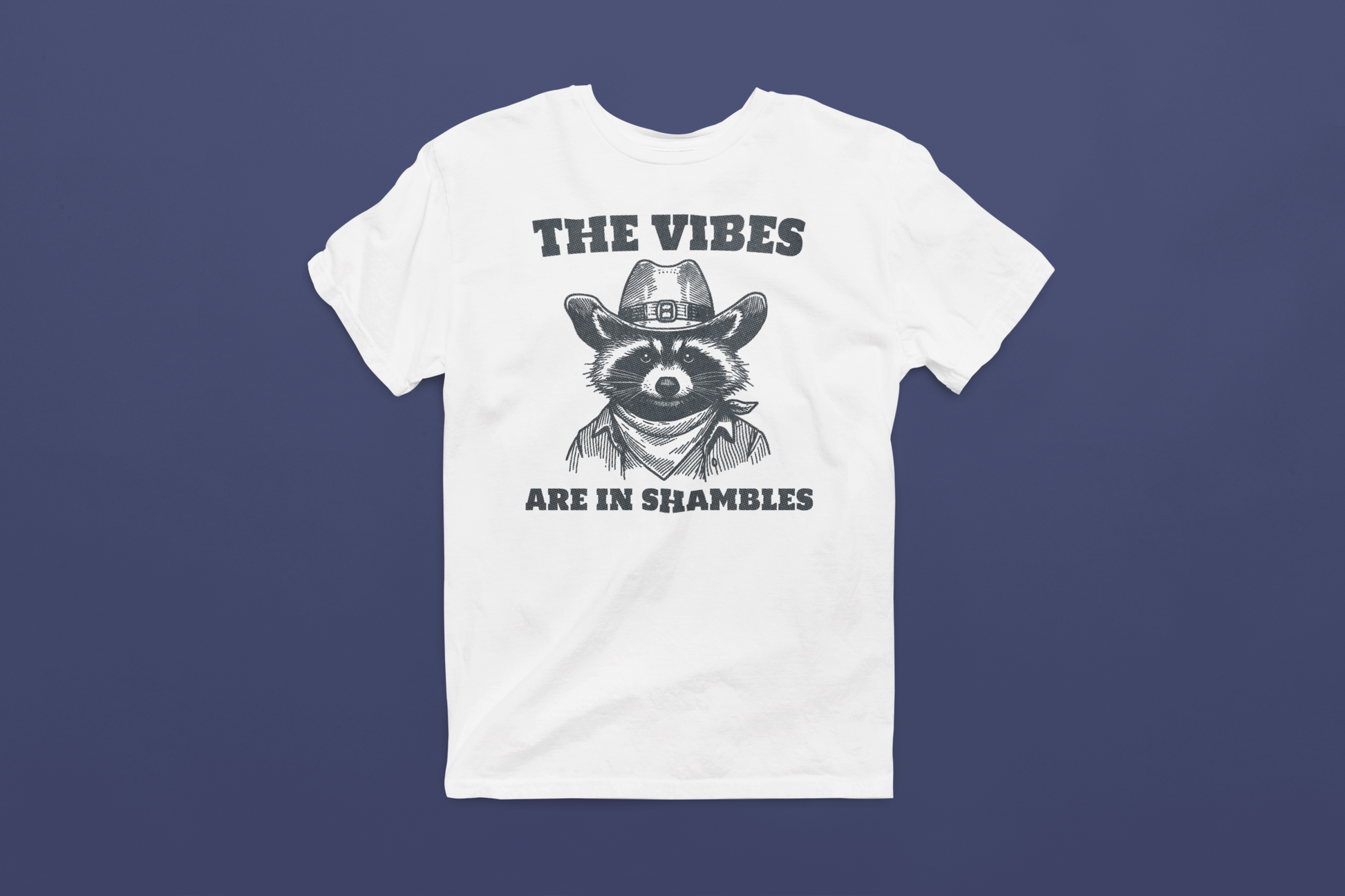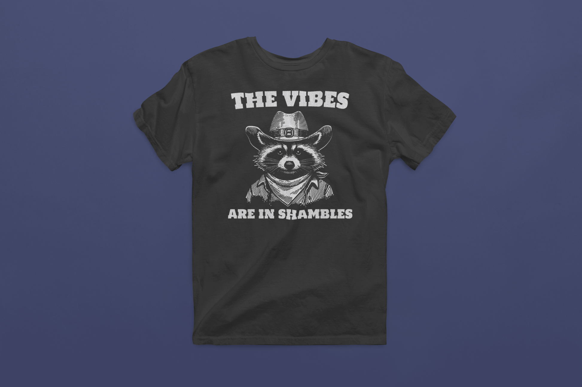 Introducing our 'Sheriff of Shambles' t-shirt, because apparently, even the vibes need law and order. Behold, the cowboy racoon, ready to wrangle the unruliest of vibes. This shirt is perfect for those days when you're embracing the chaos with a smirk. Wear it proudly and let the world know you're the sheriff of your own shambolic domain.