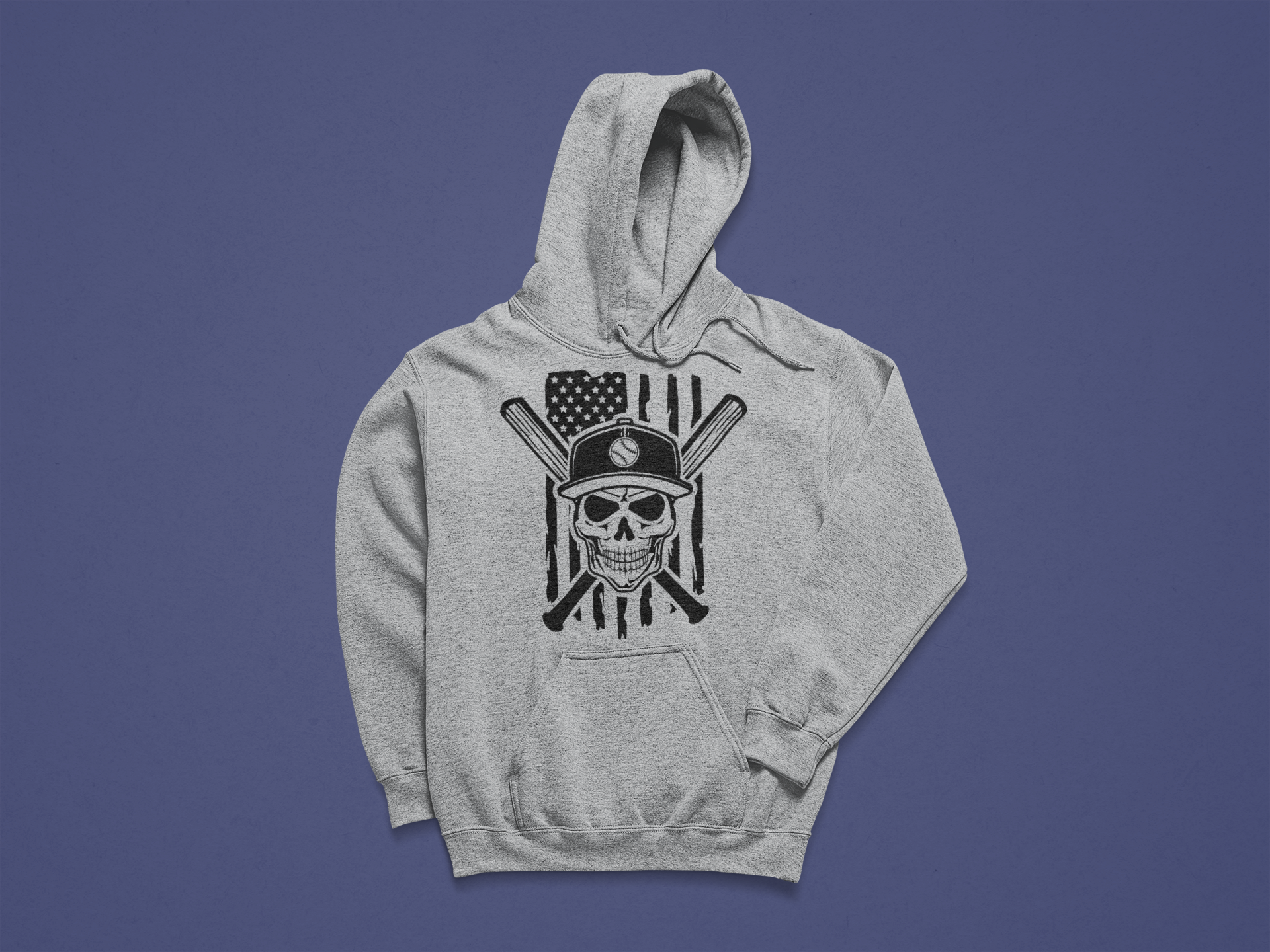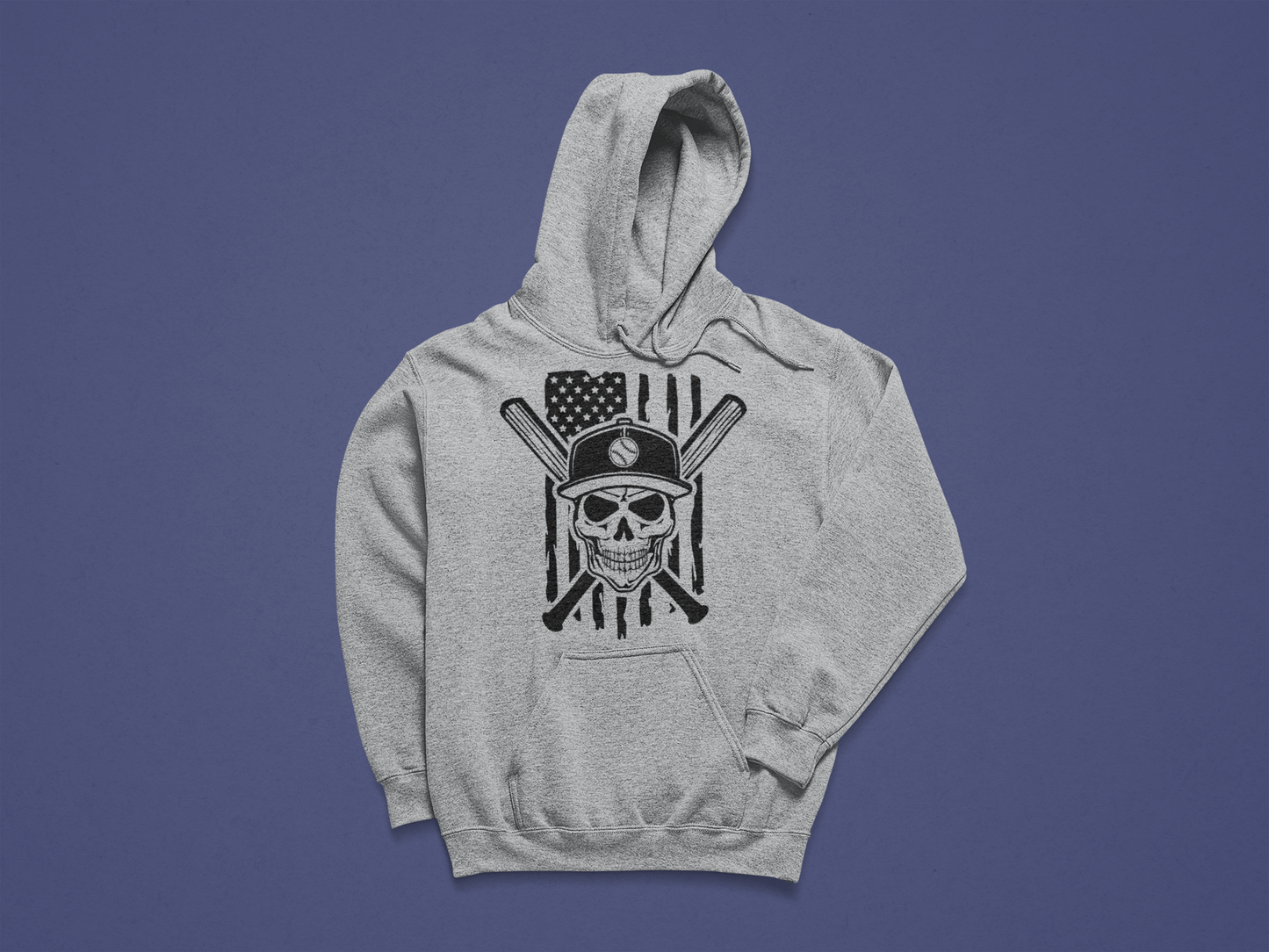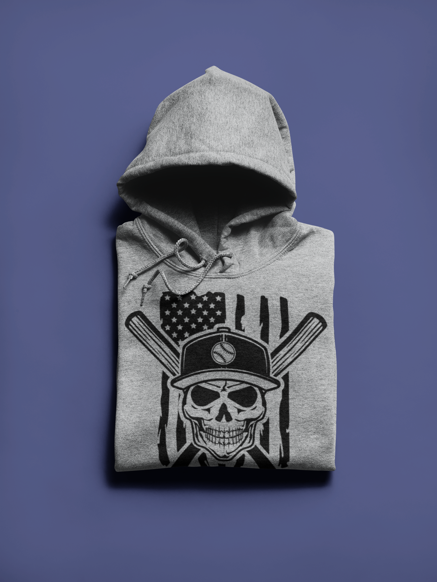 Gear up with unparalleled patriotism and grit with our Skull Strike hoodie. Featuring a skull donning a baseball cap and crossed bats in front of the American Flag, this hoodie embodies the spirit of resilience and determination. Crafted for the bold and fearless, it's more than a hoodie - it's a symbol of unwavering allegiance to the game and the nation. Stand tall, wear it proudly, and let your fierce spirit shine through with every step. Dominate the field of life with the Skull Strike tee from Gritty Gear Company.