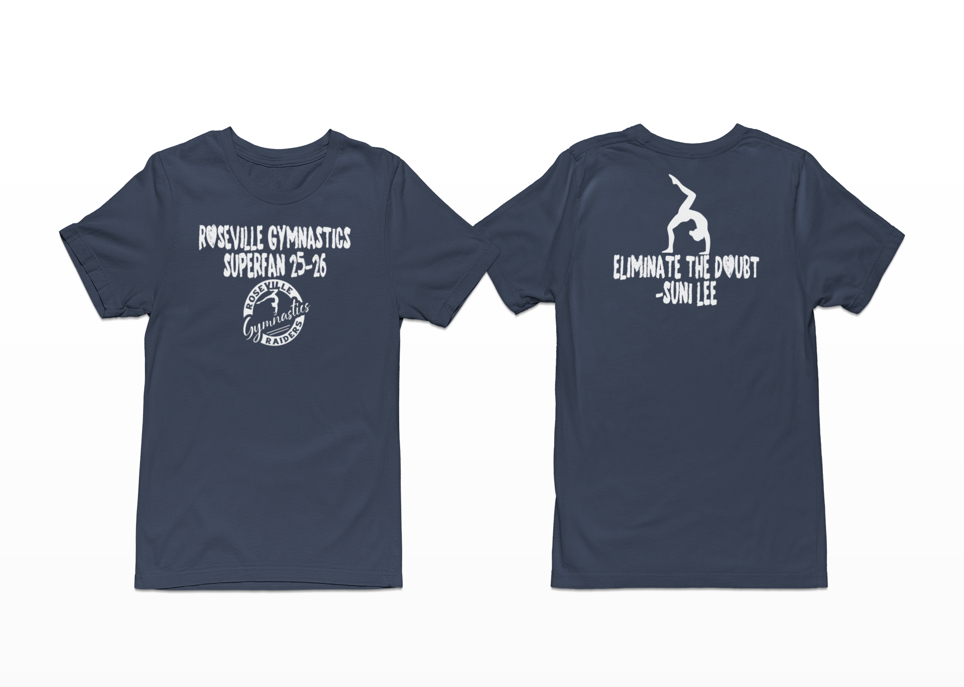 Show up, stand out, and cheer loud! This tee is made for the ultimate Roseville Gymnastics supporter! The front proudly features Roseville Gymnastics Superfan 25-26 with the Raiders logo, so there is no mistaking who you're backing. On the back, a gymnast silhouette paired with the powerful words of Suni Lee - "Eliminate the Doubt" - brings inspiration and team pride together in one bold statement.
