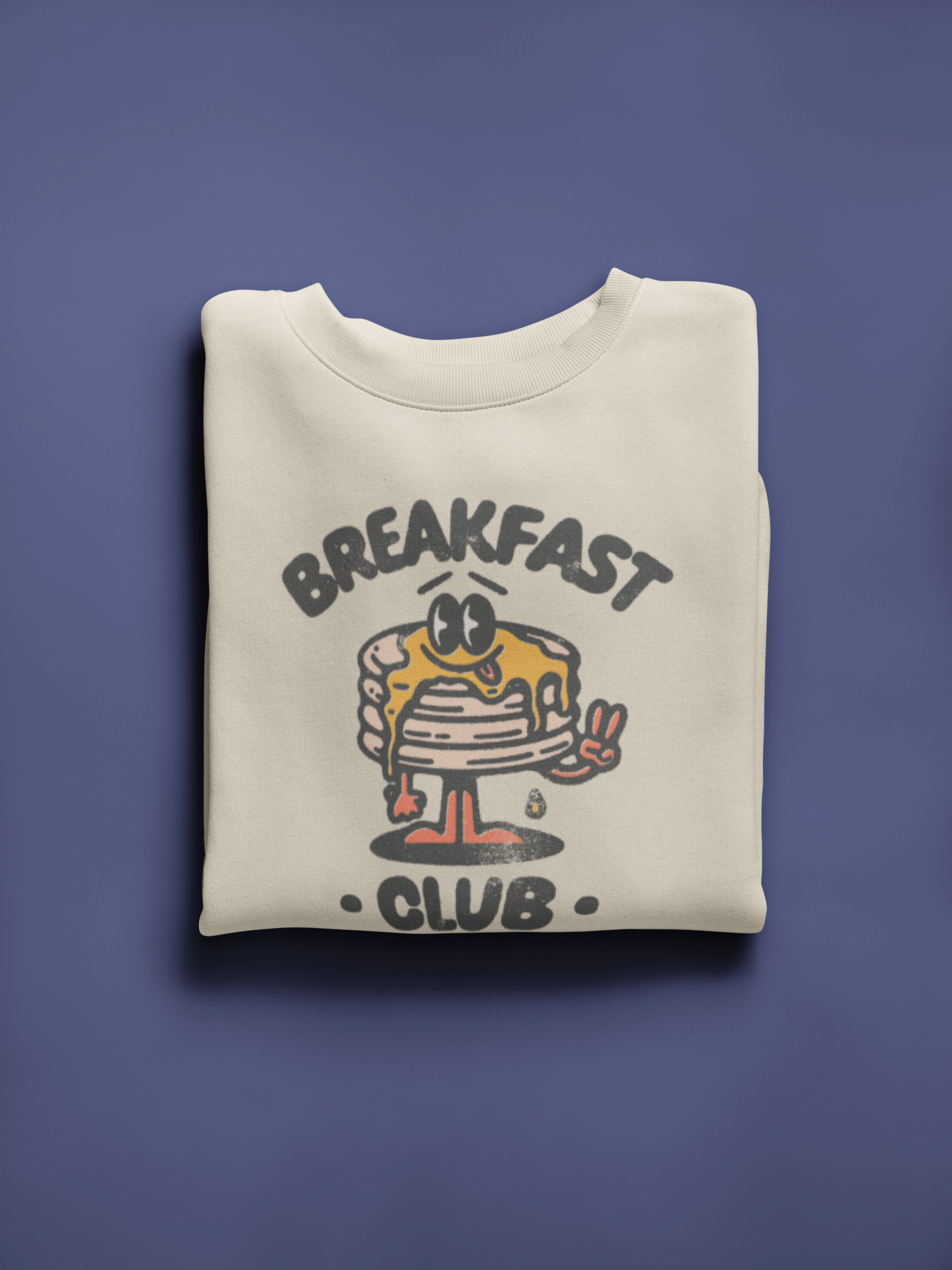 Get ready to start your day with a delicious dose of nostalgia! Our crewneck sweatshirt features a retro pancake character proudly holding up the peace sign, bringing back memories of carefree morning and tasty breakfasts.