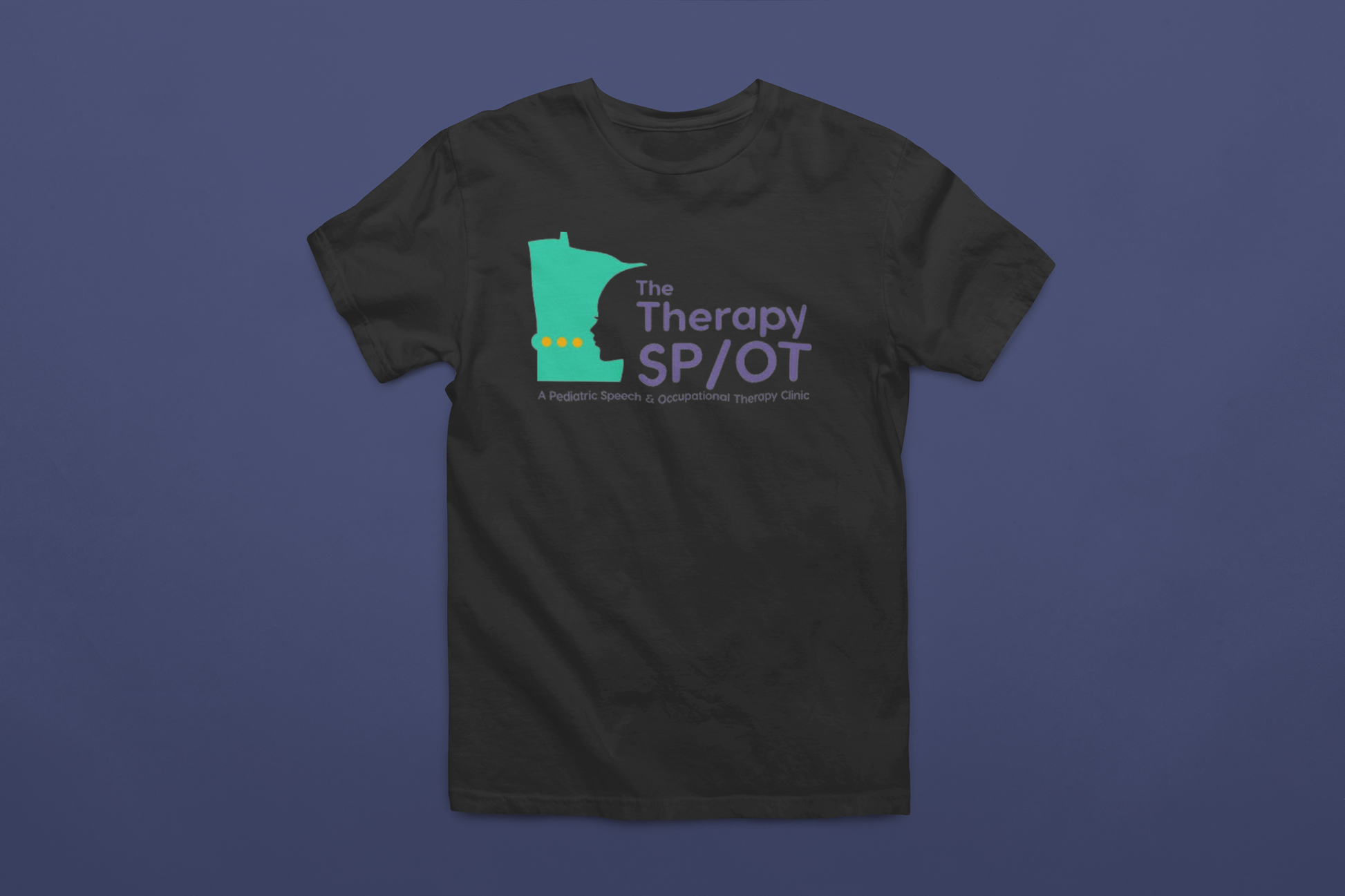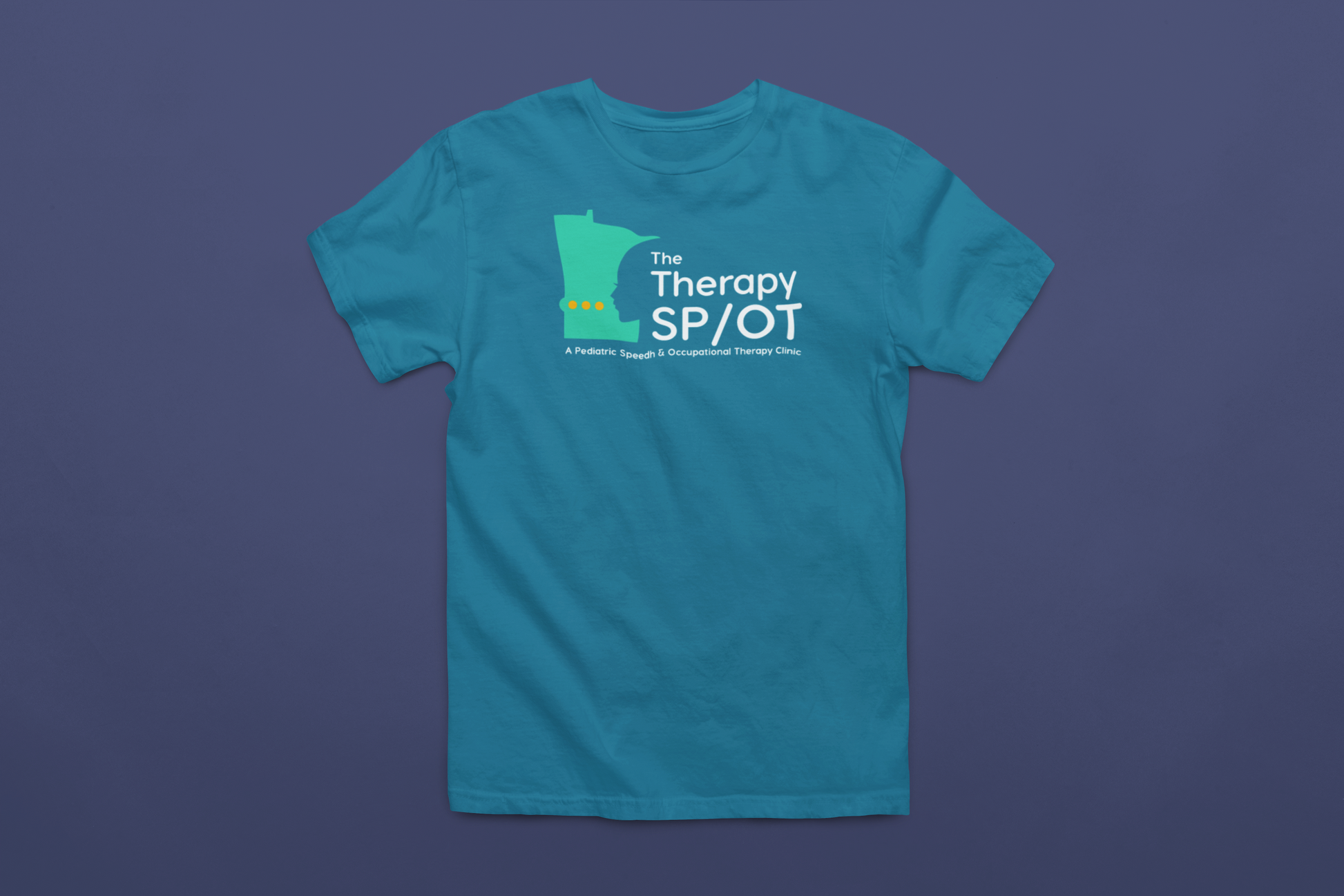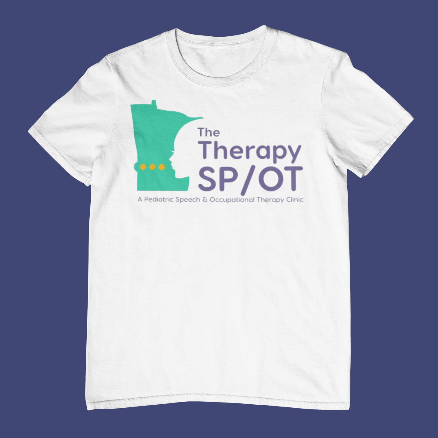 The Therapy Spot's t-shirt proudly showcases the vibrant and eye-catching company logo large, and in charge, on the front of the t-shirt.