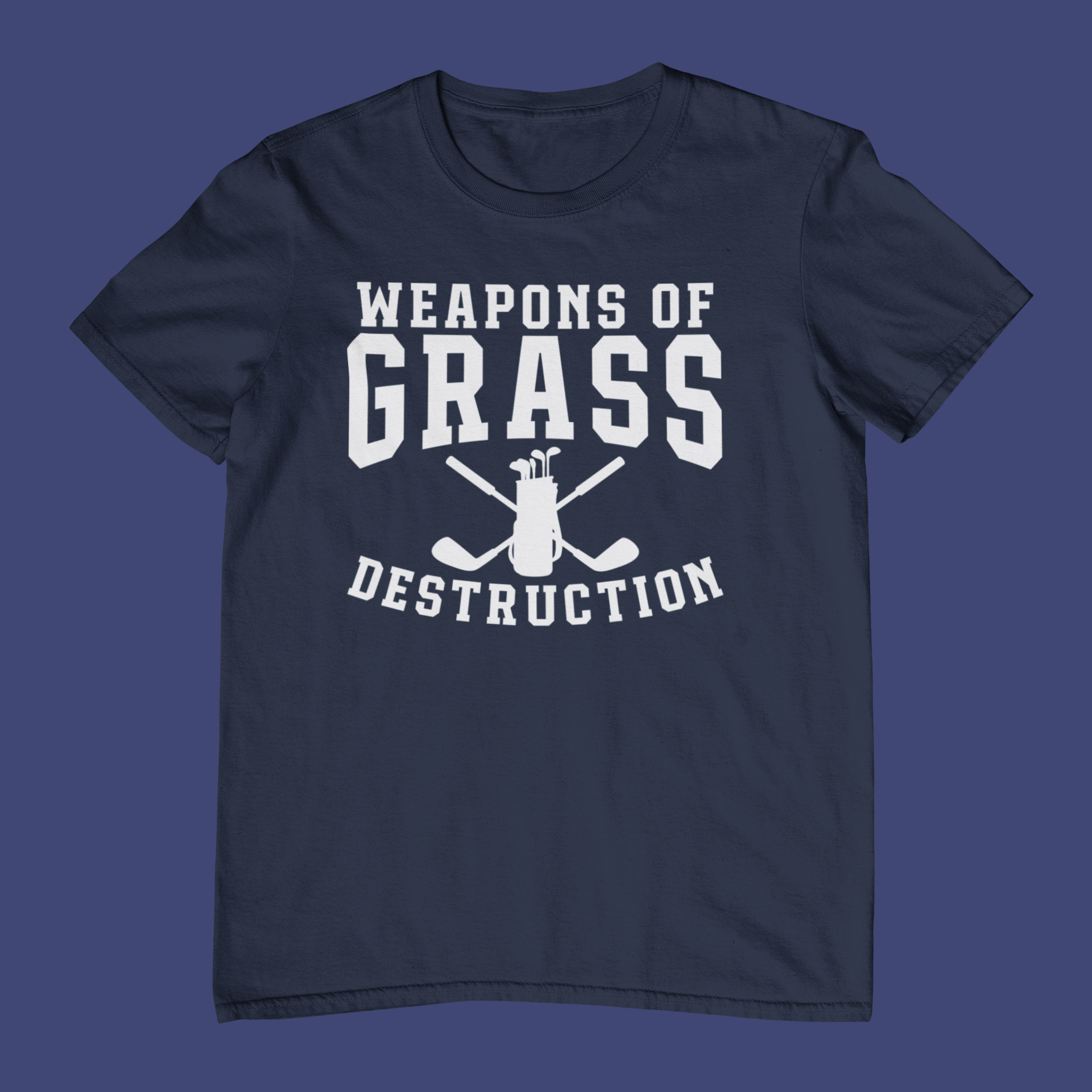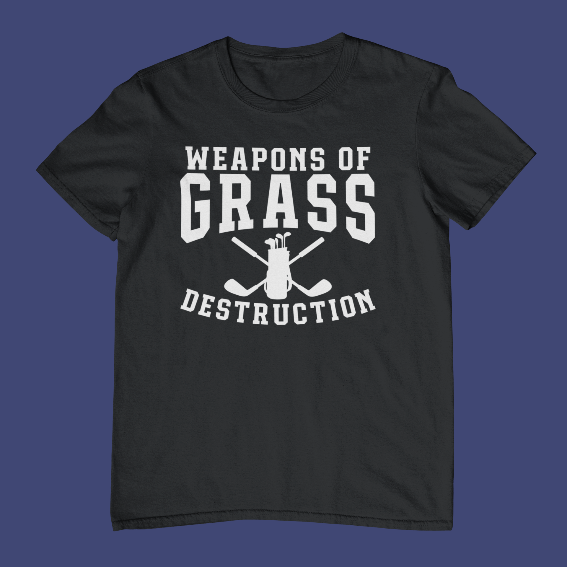 Gear up for the green warfare with our 'Weapons of Grass Destruction' golf tee. Swing into action and let the fairway know you're armed with more than just a club. This shirt isn't just about the perfect swing; it's a declaration of war on that unsuspecting grass. Because nothing says "I mean business on the golf course" like a shirt that declares your relentless quest to annihilate every blade of grass in your path. Fair warning: you might intimidate the lawn more than your opponents. Now go forth, my fearless golfer, and conquer the greens like the true warrior you are!