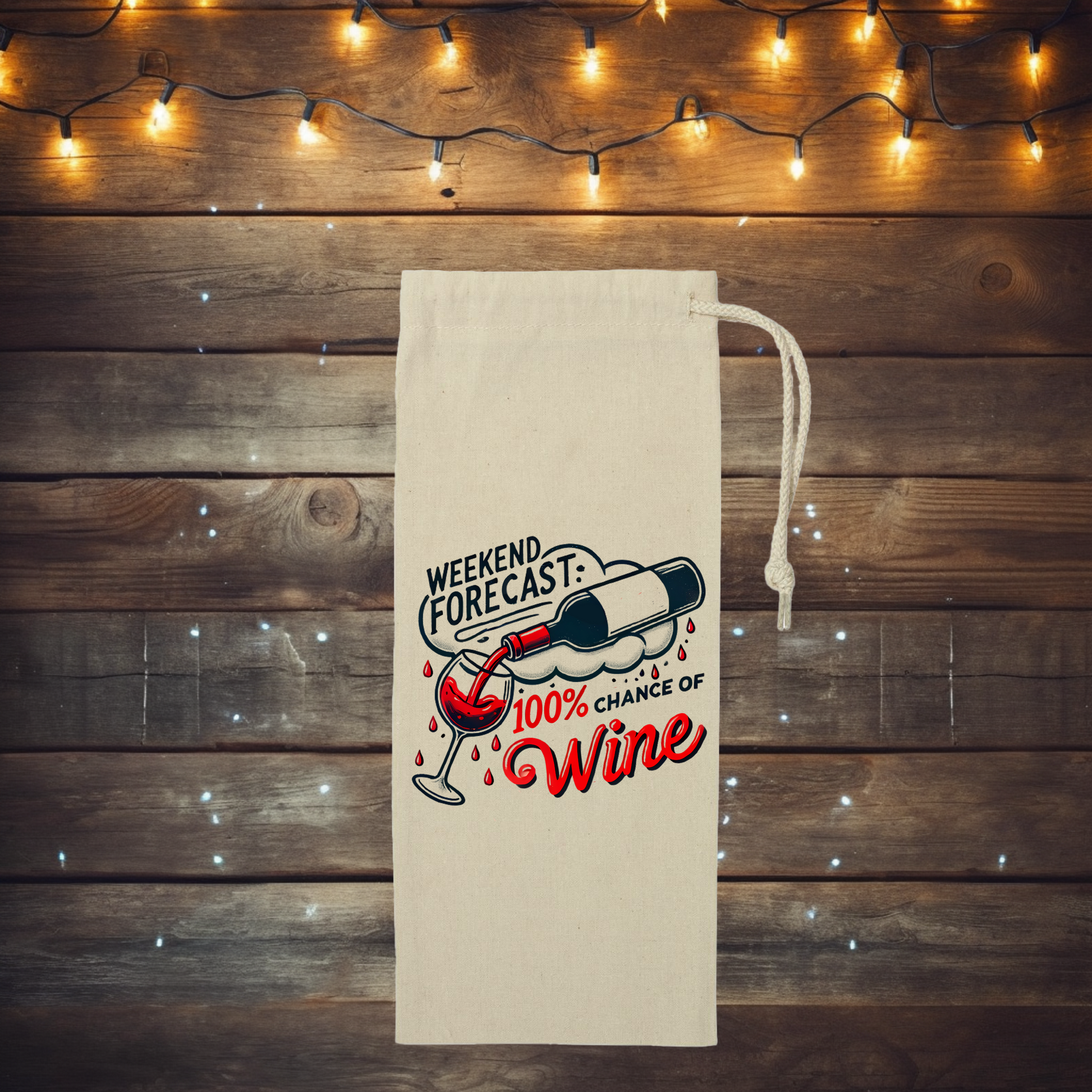 Brace yourself for the weekend with the Weekend Forecast canvas wine bag. Because let's be real-nothing else is forecasted when the weekend hits. Crafted from durable, 100% cotton canvas, this bag is ready to handle your bottle and carry it with the same no-nonsense attitude you bring to every Friday night. Whether you're heading to a party or just gifting a bottle of red to a friend, this bag has got your back. No rainchecks, just wine.